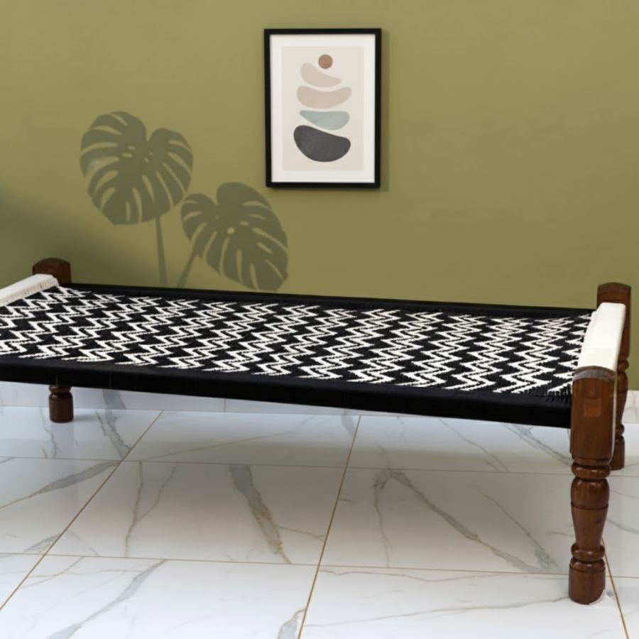 Furnshine – Cru Solid Sheesham Wood Handwoven Charpai/Khatiya (Black & White)
