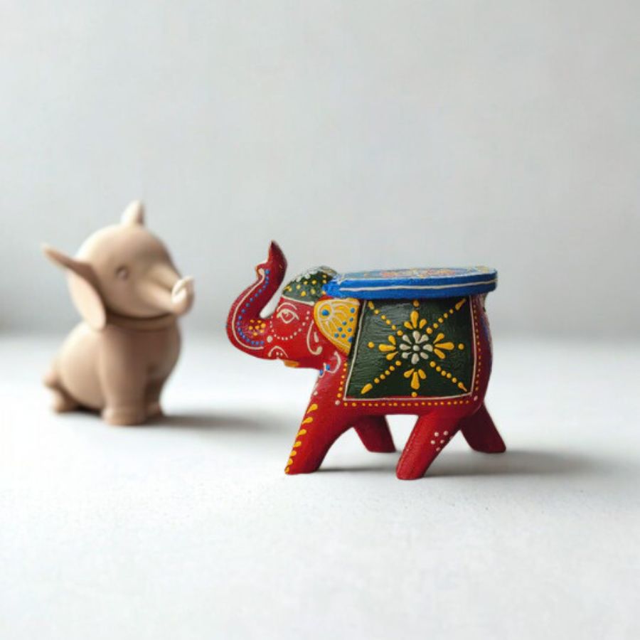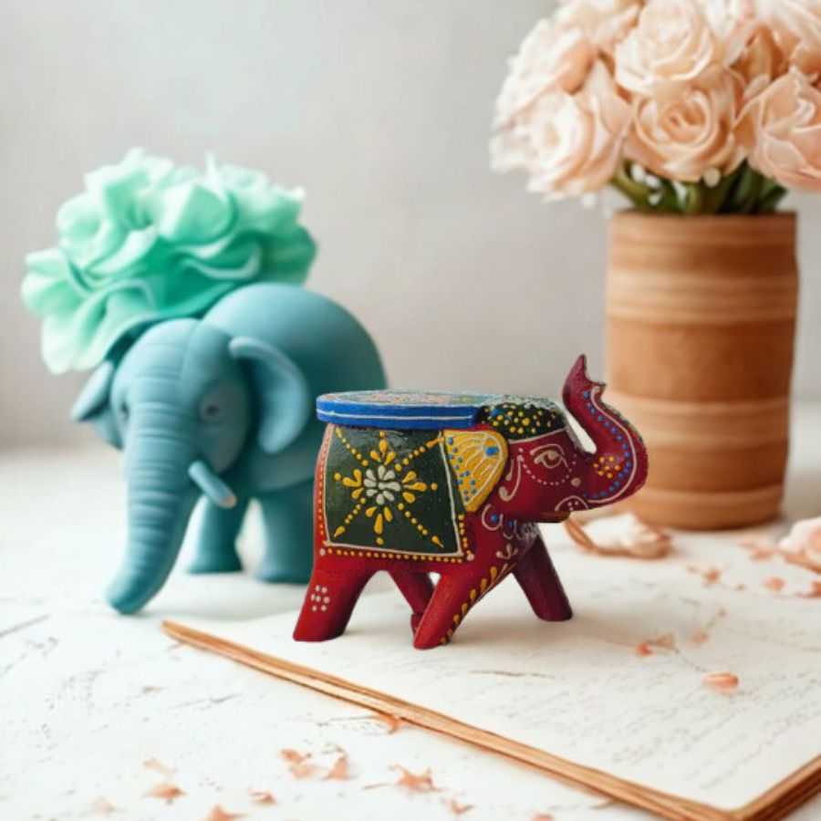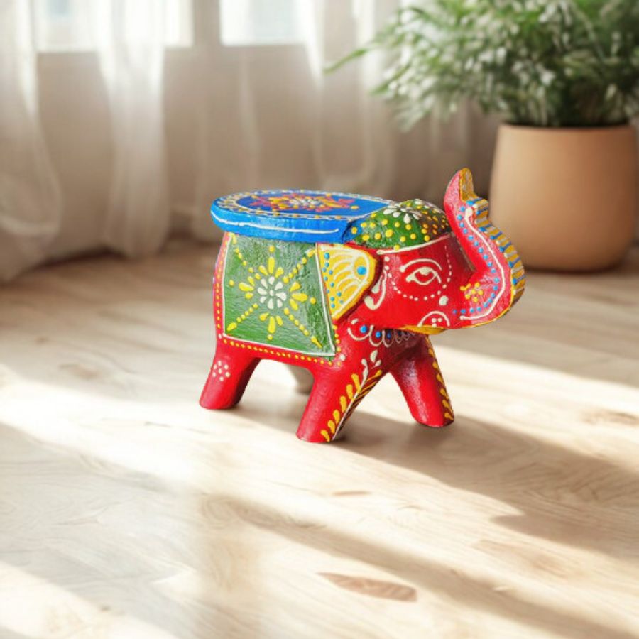 Add a touch of traditional charm to your décor with this Cute Wooden Small Elephant Stool, beautifully hand-painted and handcrafted by skilled artisans. Designed in a vibrant red base with intricate folk-style motifs, this miniature elephant stool reflects India’s rich cultural heritage and artistic finesse. Its compact size makes it a versatile décor accent—perfect for home décor, pooja rooms, mandirs, shelves, foyers, or as an eye-catching showpiece. The flat top enhances its stool-inspired look, while the detailed patterns and bright colors create a lively, festive appeal. Made from quality wood, this decorative elephant is sturdy yet lightweight, ensuring easy placement anywhere in your home. Ideal for gifting during festivals, housewarmings, or special occasions, it symbolizes wisdom, prosperity, and good luck. Whether styled alone or paired with other ethnic décor items, this hand-painted elephant stool adds warmth, color, and timeless elegance to any space.