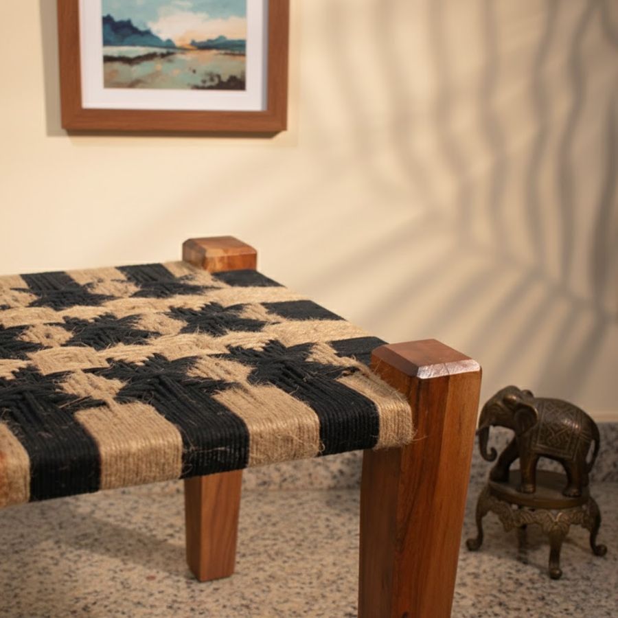 The Dale Solid Wood Black & Natural Jute Handwoven Stool from Furnshine blends eco-friendly craftsmanship with elegant minimalism. Handwoven by skilled women artisans using natural cotton and jute on a reclaimed wood frame, it elevates home or patio decor with its sturdy build and striking design. Lightweight and versatile, this stool serves well as extra seating, a plant stand, or a decorative accent. Its black and natural jute pattern highlights traditional weaving techniques, making each piece unique and sustainable. Perfect for modern, rustic, or bohemian interiors, this stool is both functional and a statement piece.
