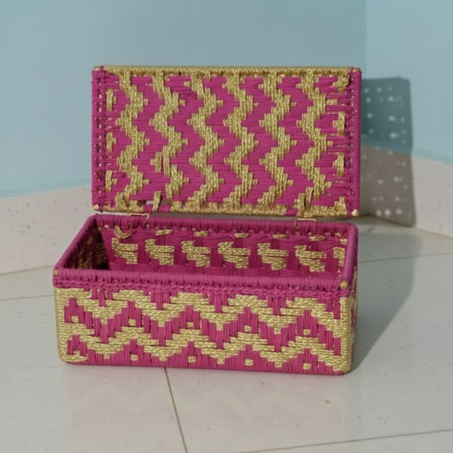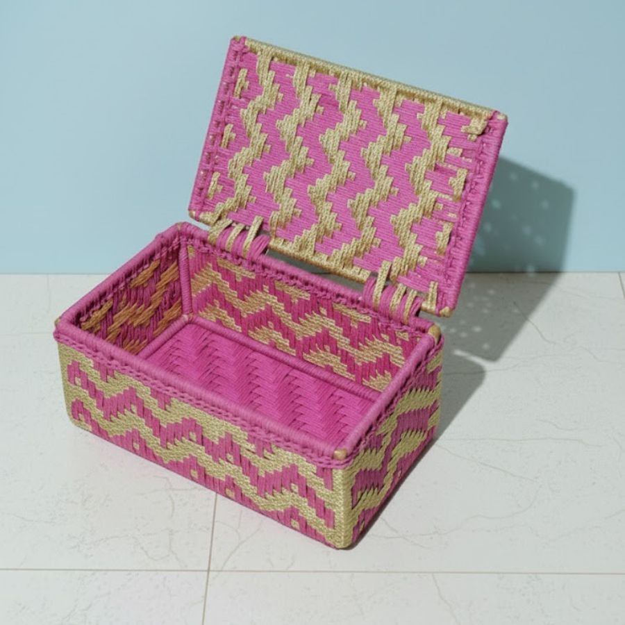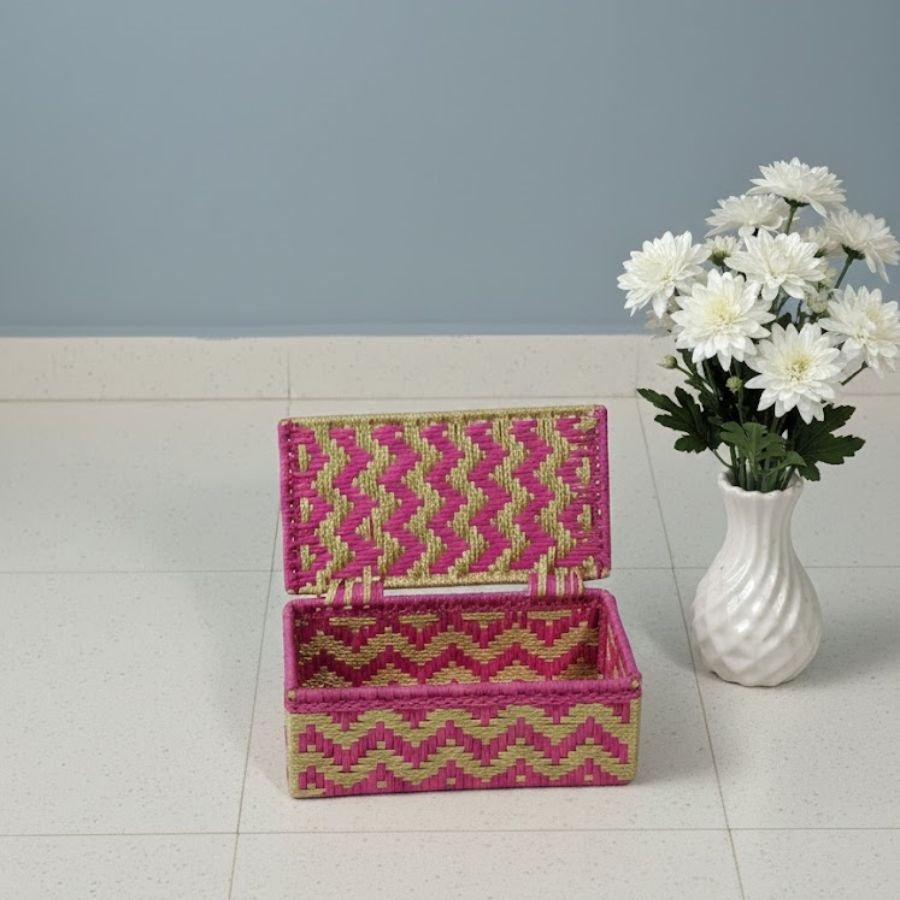 Elevate your gifting experience with this Dallin Traditional Rajasthani Woven Gift Box for Festive Hampers – Pink & Golden. Made using traditional weaving techniques, this vibrant storage box features a striking pink and golden zig-zag pattern that reflects the rich artistry of Rajasthan. Perfect for festive gifting, hampers, trousseau packing, or home décor, it offers both style and utility. Its sturdy build and spacious interior make it ideal for storing dry fruits, jewelry, cosmetics, pooja essentials, or gifting items. Add a touch of ethnic charm to your celebrations with this eco-friendly, artisanal keepsake box that blends culture, craftsmanship, and functionality.