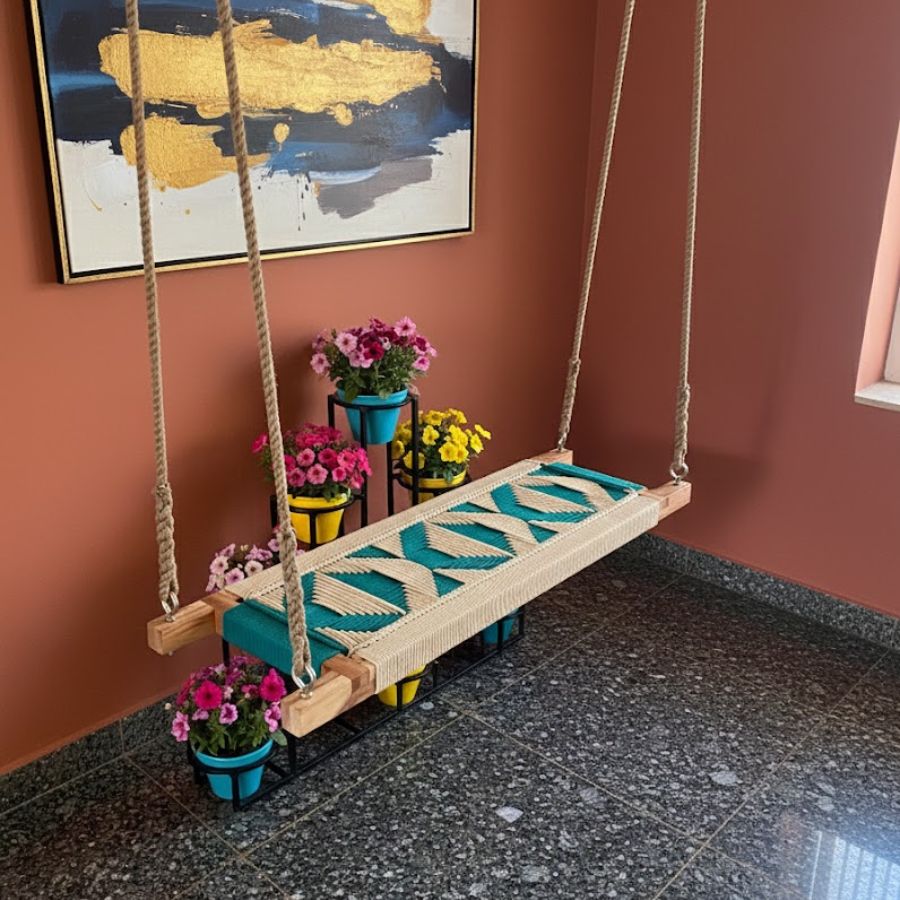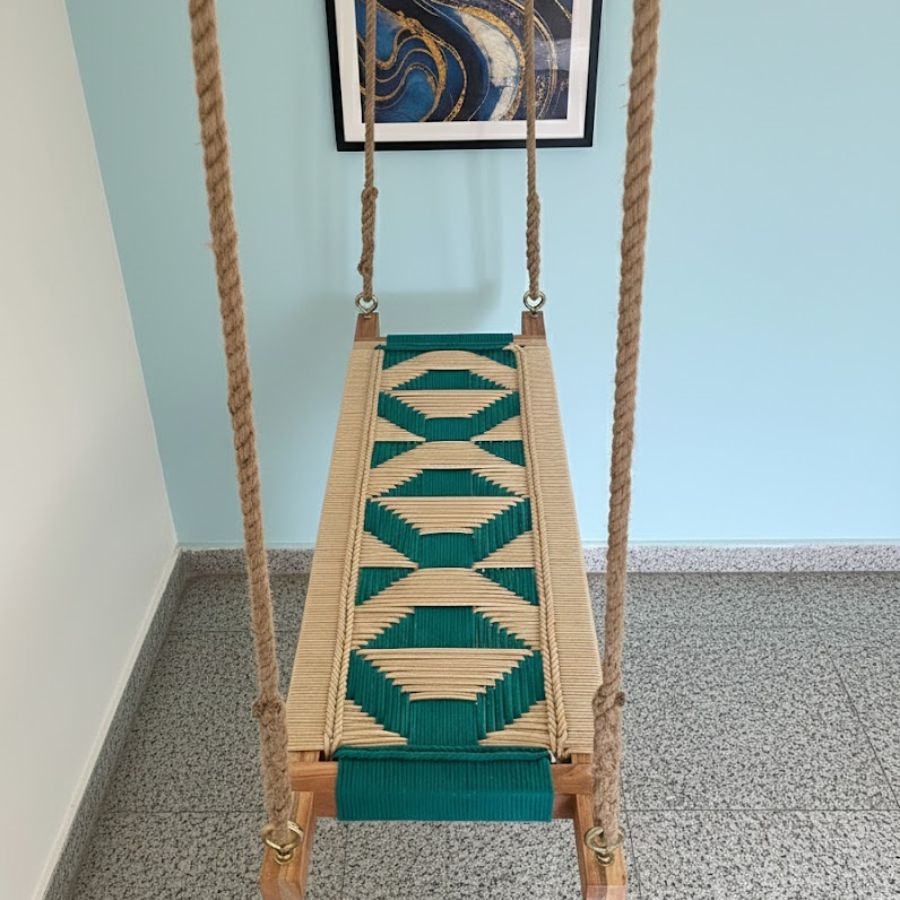 This handcrafted indoor swing features a stunning blend of traditional artistry and contemporary design, making it a statement piece for any home décor. Crafted from robust wood and intricately woven with beige and mint green ropes, this swing offers both comfort and style. Its versatile look effortlessly complements modern, bohemian, or ethnic interiors. The swing comes paired with a matching woven wall art piece, enhancing the aesthetic appeal of your living space and providing a relaxing spot for adults or children to enjoy.