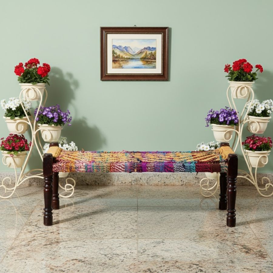 Brighten any space with this Denver Handwoven Sheesham Wood Bench (Multicolor) from Furnshine, crafted in solid Sheesham wood and featuring a vibrant yellow and multicolor handwoven chindi and jute rope seat. Perfect for balconies, patios, and garden corners, its traditional charpai-inspired design brings playful charm and durable functionality. The sturdy, polished frame and artisanal weave offer a welcoming spot for relaxation or gathering. Accommodates up to two people comfortably and fits easily in compact areas. Easy to assemble and move, this bench combines lasting quality with artistic flair for indoor or outdoor enjoyment.