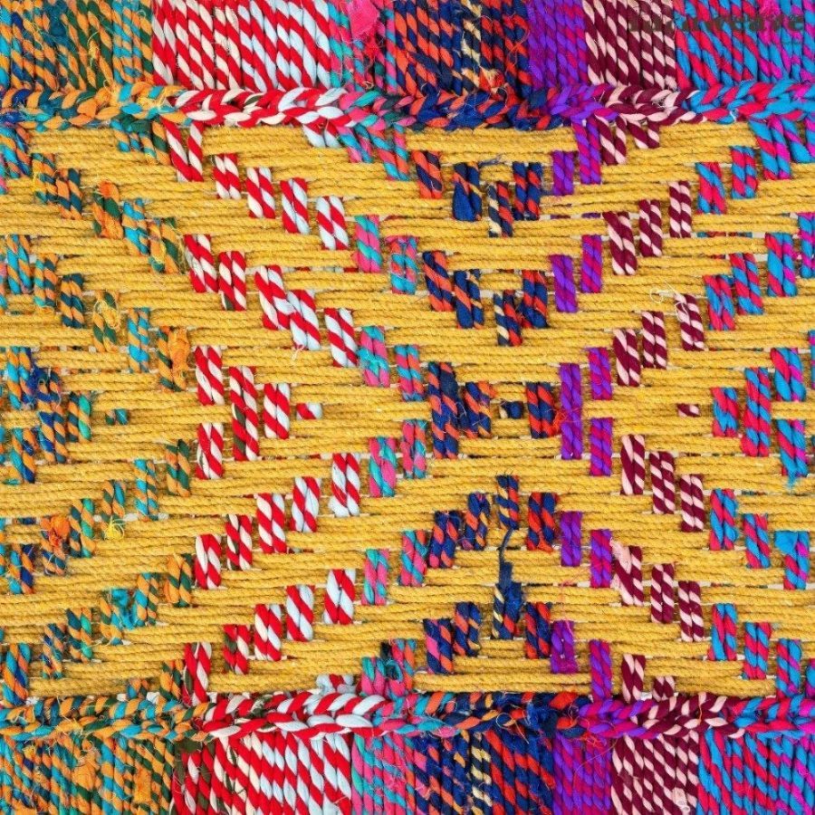 Handwoven chindi and jute rope seat in vivid yellow and multicolor.