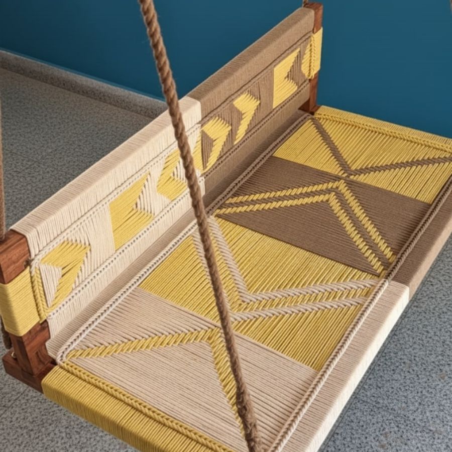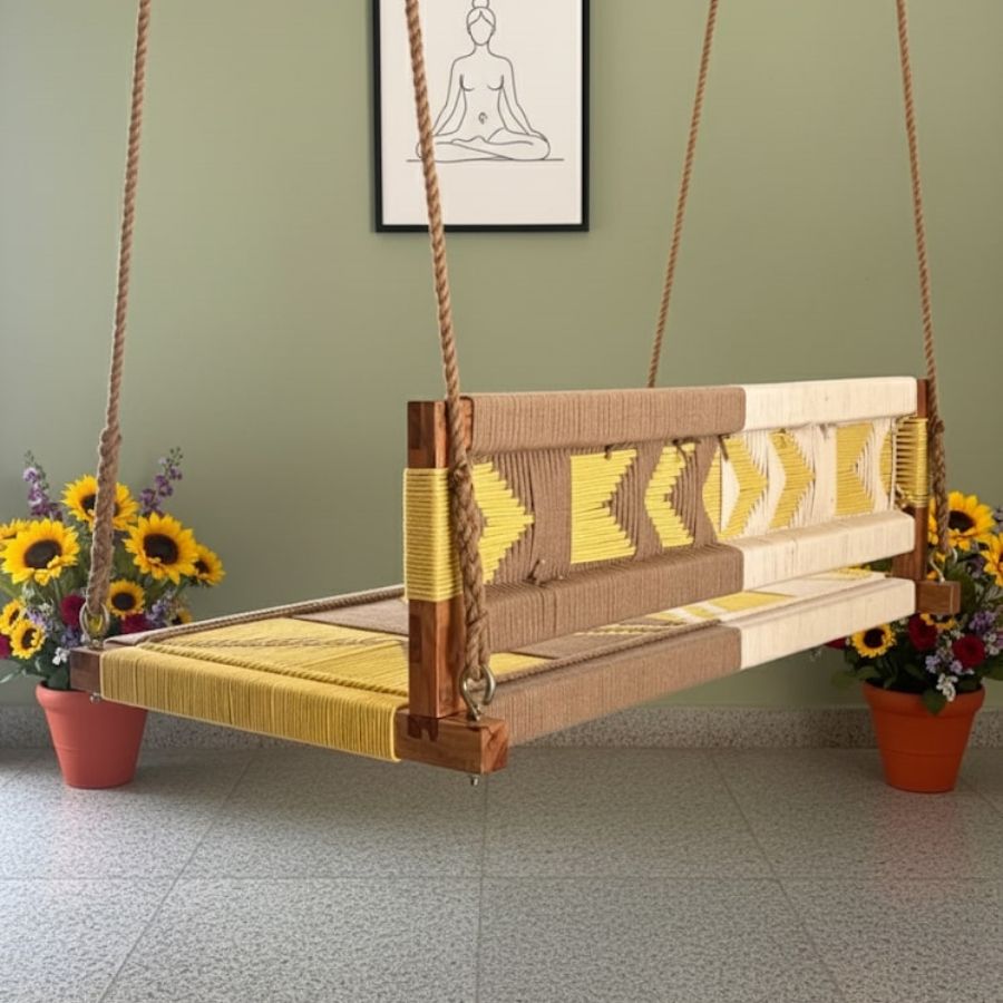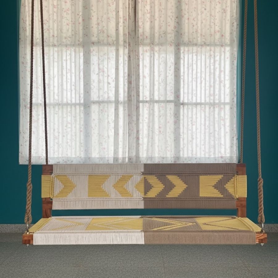 Elevate any space with this handcrafted Dimity Woven Swing with Backrest – Yellow, Beige & White, blending comfort and modern artistry. Designed for both style and durability, it’s made from sustainably sourced acacia wood and highlighted by vibrant woven patterns in yellow, beige, and white. The sturdy natural hemp ropes provide strong support for up to 250kg, ensuring a relaxing experience for both adults and kids. Perfect for living rooms, balconies, or gardens, each swing is checked for quality and made with eco-friendly materials. Installation is simple, with rope slots cut for easy mounting, making this swing the ideal combination of elegance and function.