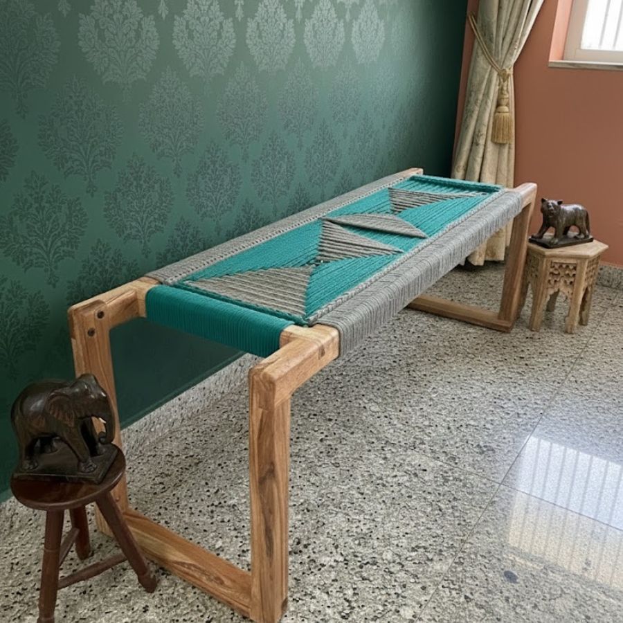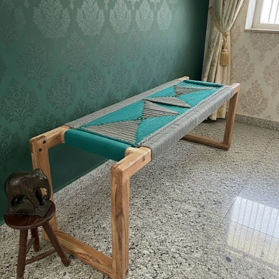 This Doe Solid Wood Handwoven Bench (Teal Green & Grey) blends modern artistry with natural warmth, making it a standout accent for any living space. The sturdy wooden frame showcases rich, organic grain patterns, while the seat features a beautifully handwoven design in Teal Green & Grey, forming an eye-catching geometric pattern. Its minimalist silhouette and durable construction make it ideal for entryways, bedrooms, balconies, or lounge areas. Comfortable, stylish, and versatile, this bench brings a touch of craftsmanship and contemporary charm into your home. Perfect for those who appreciate unique furniture that combines function with finely detailed handwork.