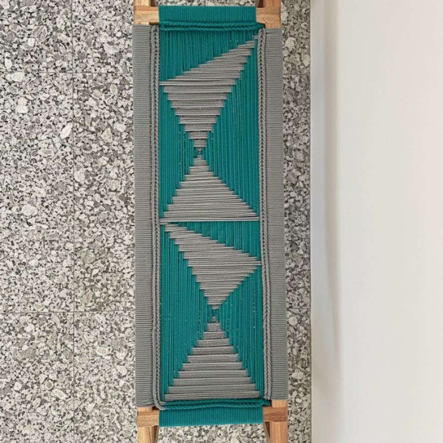Handwoven seat in Teal Green & Grey geometric pattern