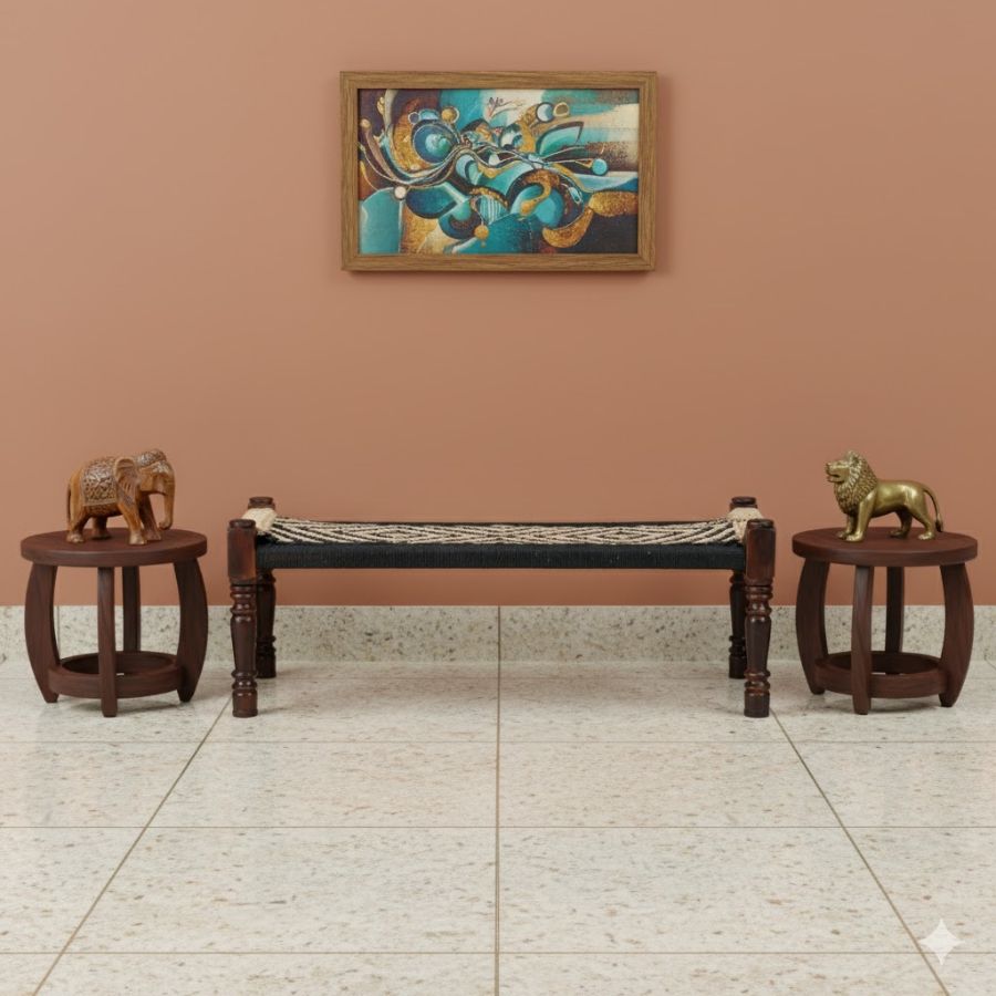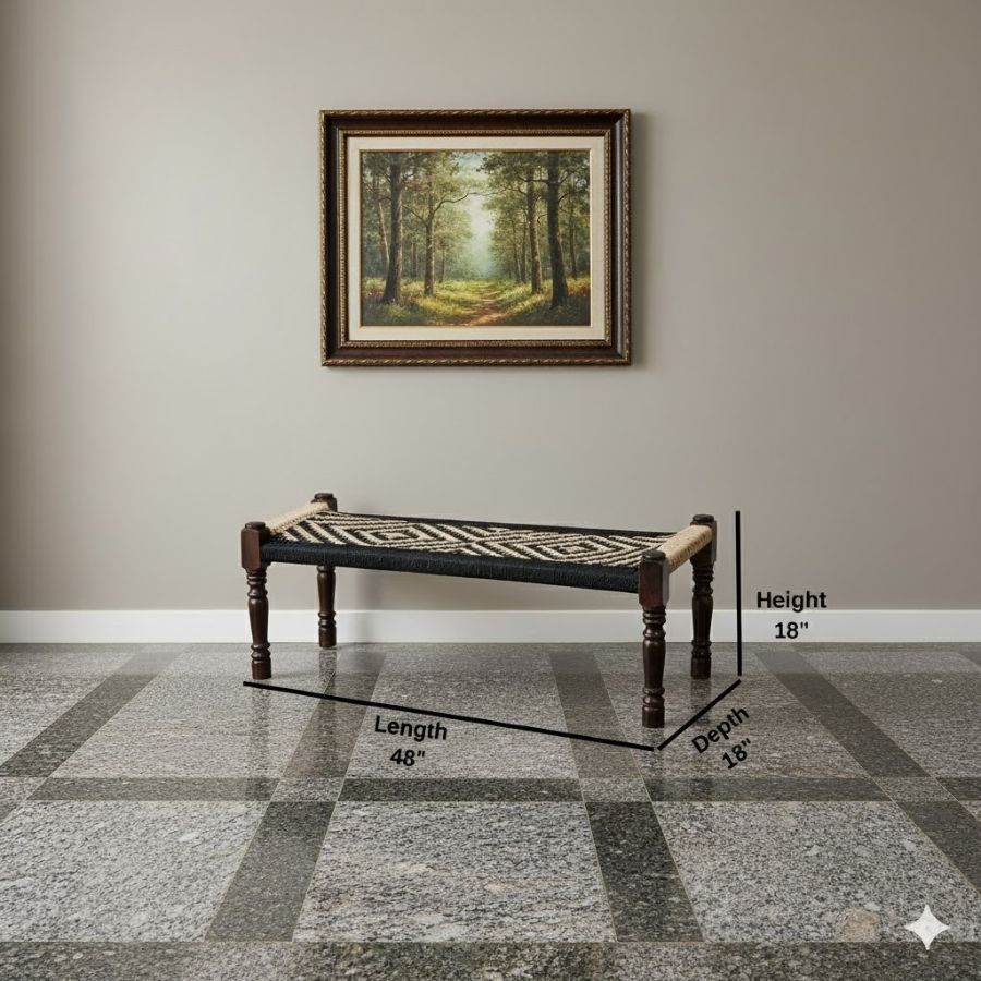 This Duska Handwoven Sheesham Wood Bench (Black & Natural Jute) combines traditional Indian craftsmanship with versatile utility for indoor and outdoor spaces. Featuring a robust sheesham wood frame and a handwoven black and jute rope seat, the bench showcases a striking geometric pattern, delivering both visual appeal and lasting comfort. Its backless design offers flexible seating for patios, entryways, balconies, or living rooms. Lightweight and easy to position, this artisanal piece blends rustic elegance and practical charm, making it ideal for relaxing, entertaining, or enhancing contemporary décor with authentic texture.​