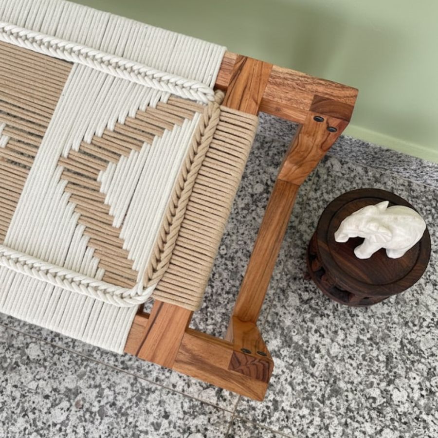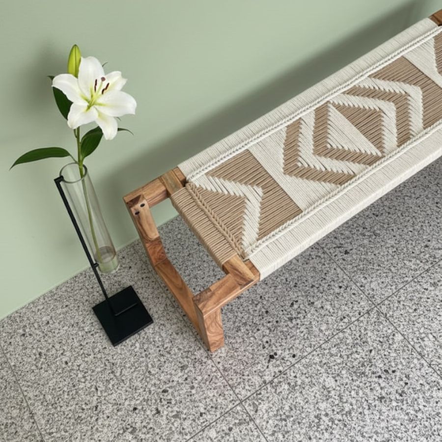 The Eaton Mid Century Modern Woven Bench (White & Beige) is a handmade masterpiece combining natural wood and cotton weaving. Crafted with 4 mm braided cotton cord on a solid wood frame, this bench adds a sculptural, playful touch to any space. Perfect for bedrooms, living rooms, entryways, balconies, or gardens, it offers both style and function. Measuring 120 cm in length and 35 cm in width, the bench provides comfortable seating with a 40 cm height. Its durable cotton cord and sturdy wood construction ensure longevity. Assembly is easy, and this modern piece brings artisanal charm to your décor.