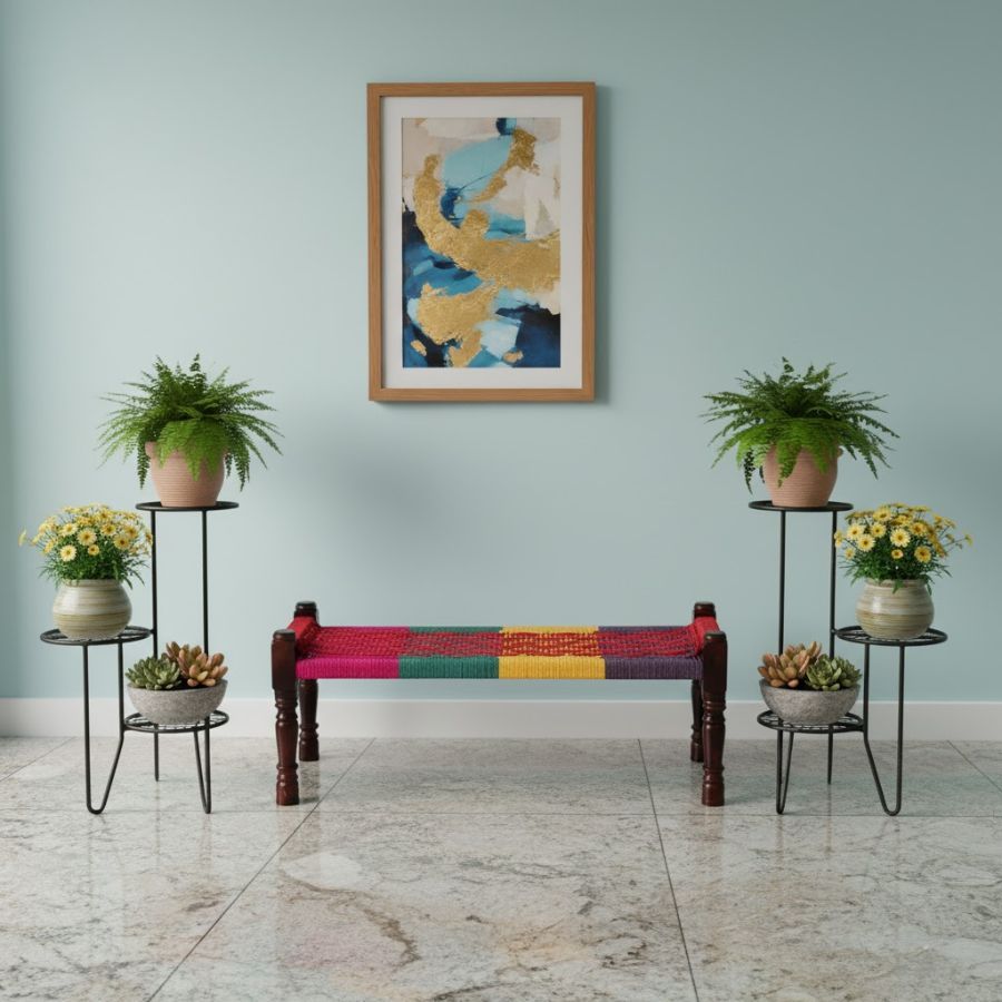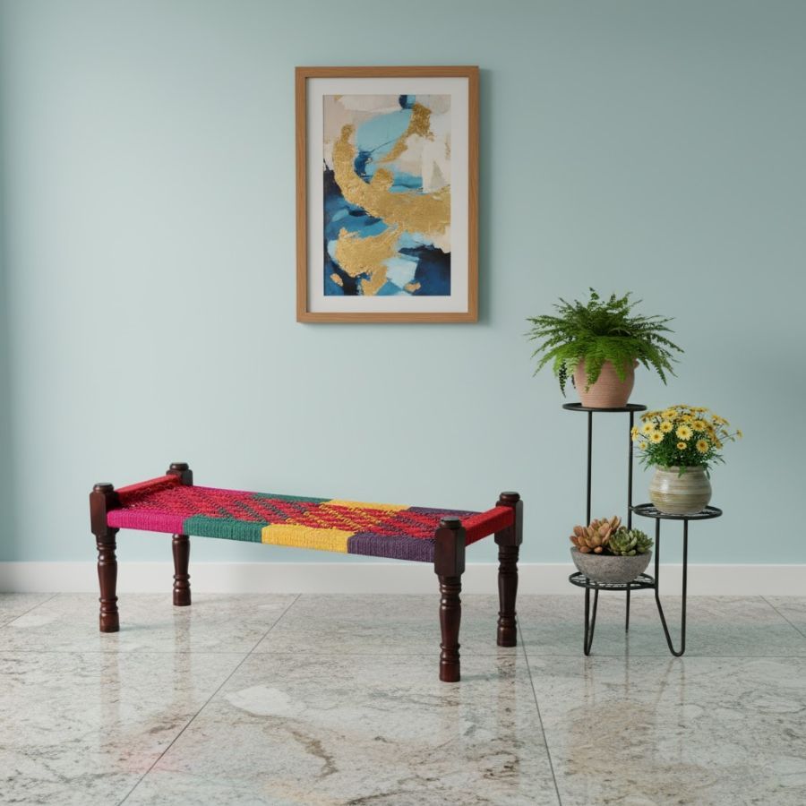 This Elmore Handwoven Sheesham Wood Bench (Multicolor) is a vibrant, handcrafted seating solution perfect for both outdoor and indoor spaces. With a sturdy solid wood frame and a multicolor handwoven rope seat, it adds a cheerful accent and traditional flair to patios, balconies, or living rooms. The bench’s artisanal construction ensures comfort and durability, while its playful mix of red, yellow, purple, and green makes it a striking decor piece. Lightweight and easy to move, this bench brings functional style, blending modern needs with Indian heritage.