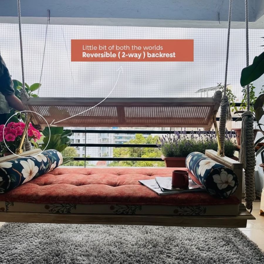 Experience refined relaxation with the Evelynn Reversible Solid Wood & Rattan Swing (White Wash Finish) for home. Crafted from high-quality Mango Wood, this swing features a real rattan backrest in a stylish rustic lime-washed finish. The clever reversible backrest lets you flip for a new look or different view, easily adapting to your space and mood. Perfect for living rooms, balconies, or patios, the Trove swing blends elegance and tradition. Paired with plush cushions and soft ropes, it ensures lasting comfort while adding a touch of Indian heritage to modern interiors.