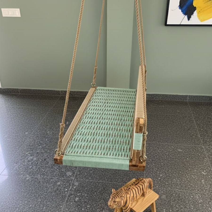 Elevate any living space with the Evian Woven Swing with Backrest ( Green Beige), a perfect combination of artisanal craftsmanship and comfort. Handcrafted from sustainably sourced acacia wood and tightly woven with durable green and beige hemp rope, this swing provides both visual appeal and long-lasting durability. Its ergonomic backrest invites relaxation for both adults and kids, making it ideal for porches, balconies, or indoor lounges. Designed for versatility, the swing’s soothing color palette adds a refreshing touch to contemporary or traditional décor.
