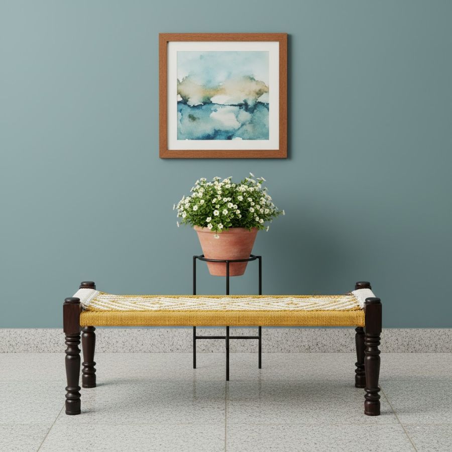 This Genesis Handwoven Sheesham Wood Bench (Yellow & White) blends vibrant style with artisanal craftsmanship for any space. Crafted from high-quality sheesham wood, its sturdy frame features a handwoven cotton rope seat in lively yellow and white geometric patterns, offering both strength and cheerful accent. Lightweight and durable, the bench is perfect for indoor and outdoor settings—ideal for patios, balconies, living rooms, or entryways. Versatile and eye-catching, it adds a unique boho touch and lasting comfort to modern, rustic, or eclectic décor.