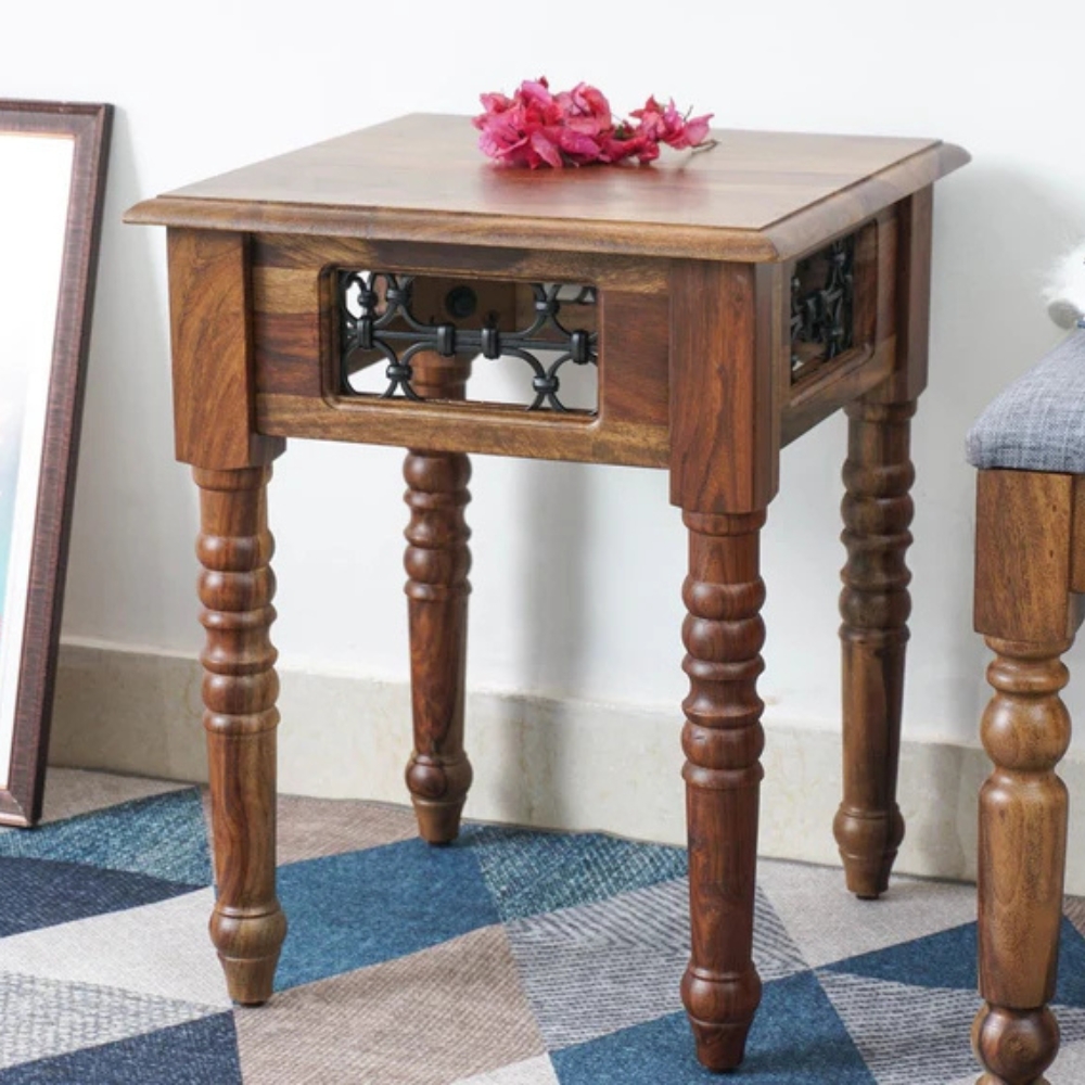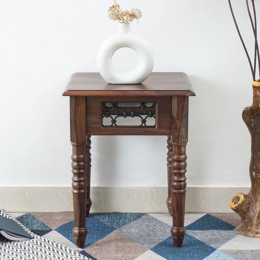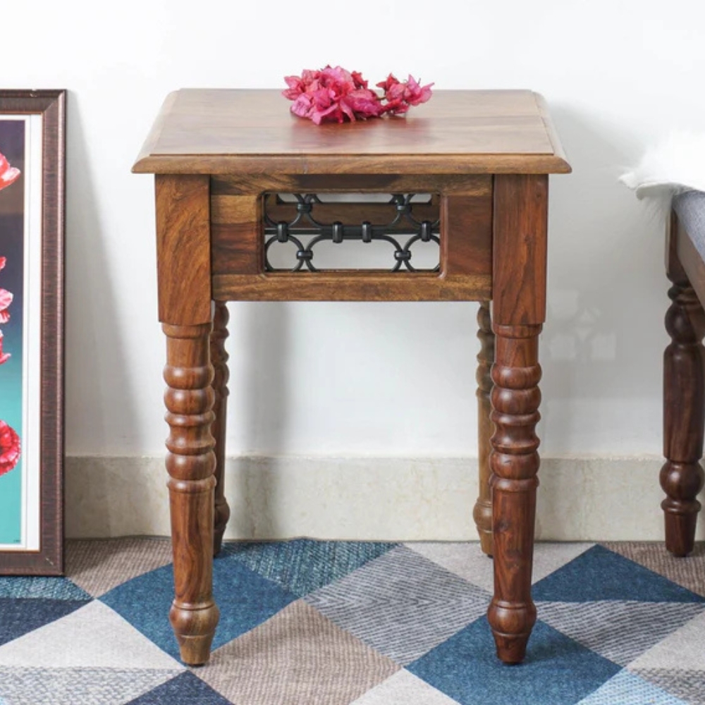 Enhance your living room with this end table from Furn Shine. Made from kiln-dried and chemically treated sheesham wood for stability and safety, its legs are crafted from laminated wooden panels for added strength. The clear and wood stain lacquer finish provides a smooth, abrasion-resistant surface. Featuring high-gauge, non-magnetic mild steel with a Jaali design, this piece combines aesthetic appeal with durability and robust functionality.