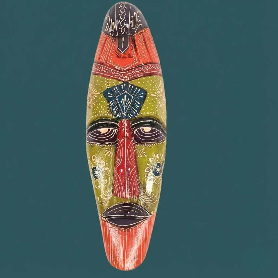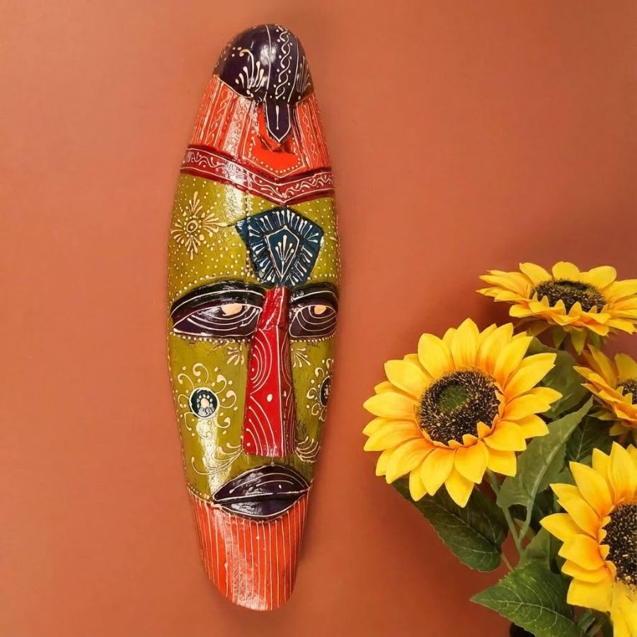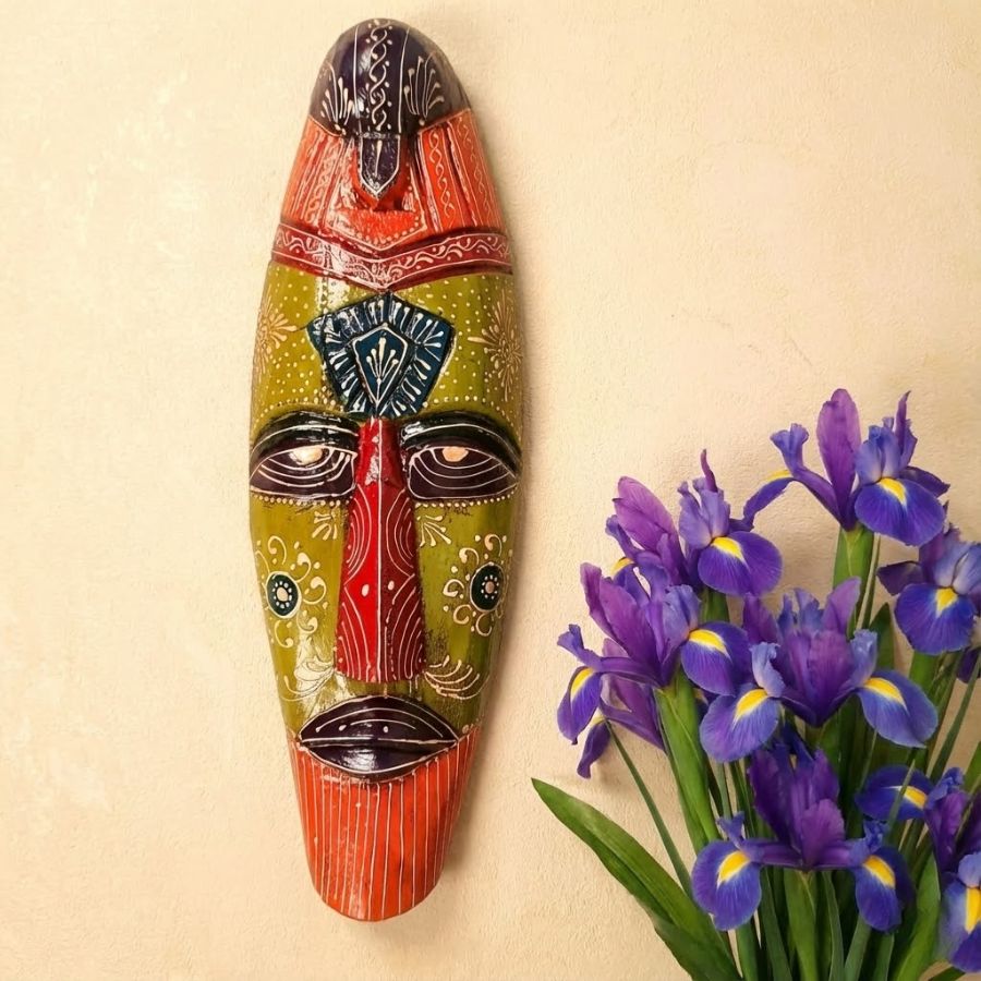 Discover the enchanting allure of this Furn Shine Mask Wall Hanging, a handcrafted wooden tribal masterpiece measuring 18 inches (36 cm) tall, 6 inches (15 cm) wide, and 3 inches (7 cm) deep, weighing 800 grams for simple wall installation. Featuring intricate green, maroon, orange, and blue hand-painted patterns inspired by African and Egyptian heritage, it serves as a powerful Nazar Battu to shield your home from negative energies. Ideal for entrances, living rooms, doors, hallways, or balconies, this elongated mask conceals minor wall flaws while injecting exotic mystique into ethnic or modern decor. Available as a single piece, it makes a thoughtful gift for home lovers, blending artistry with cultural symbolism. Keep its vivid details pristine with a quick dry cloth wipe—each artisan creation boasts unique charm.