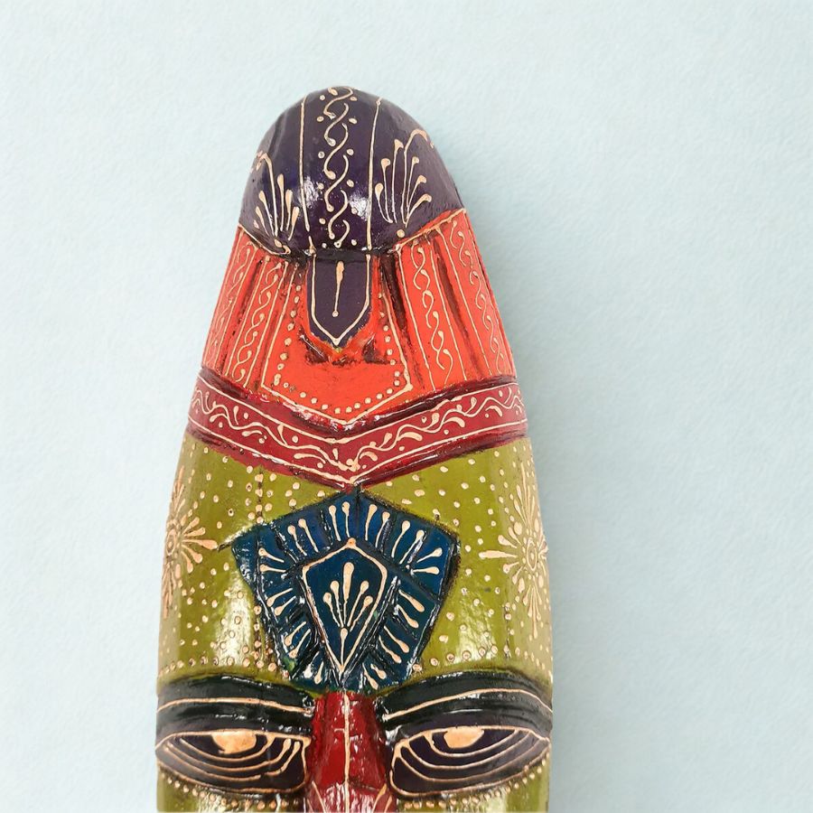 - Vibrant hand-painted tribal motifs in green, maroon, orange, blue for bold visual impact.