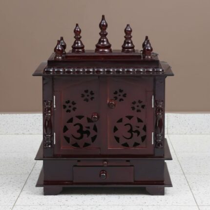Wall-mounted wooden pooja mandir with rich brown polished finish.