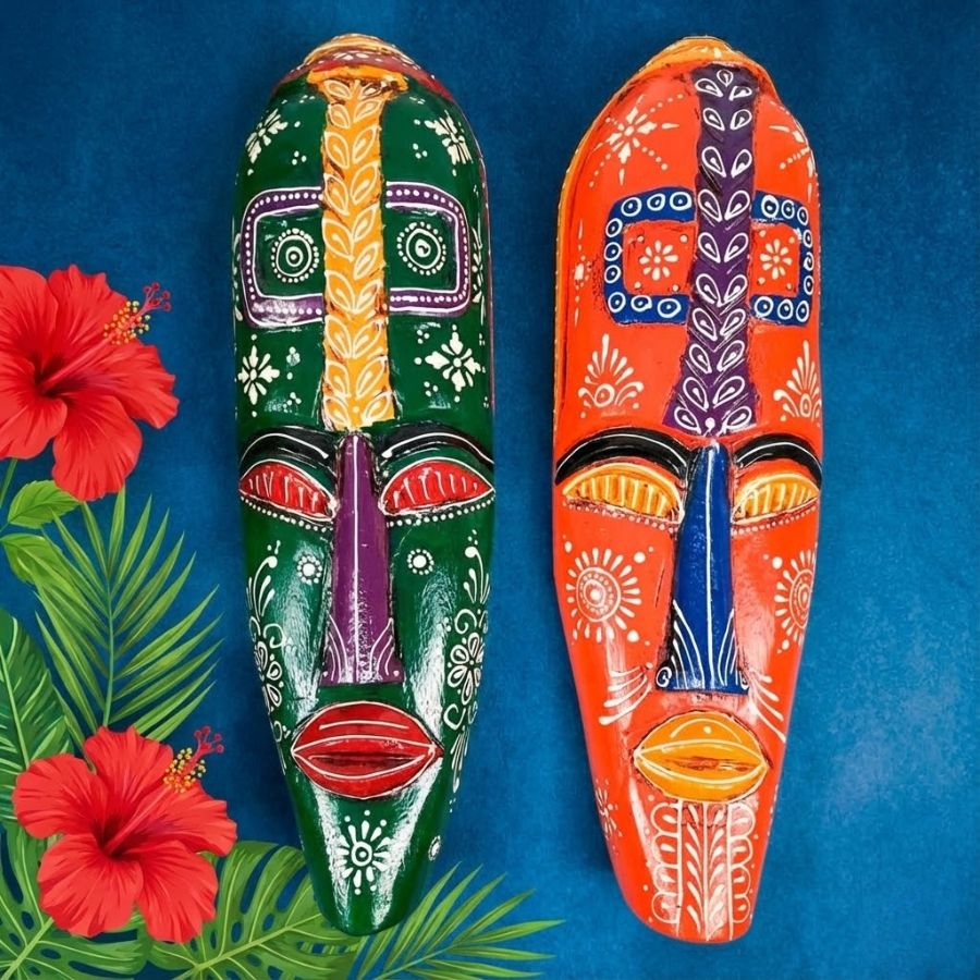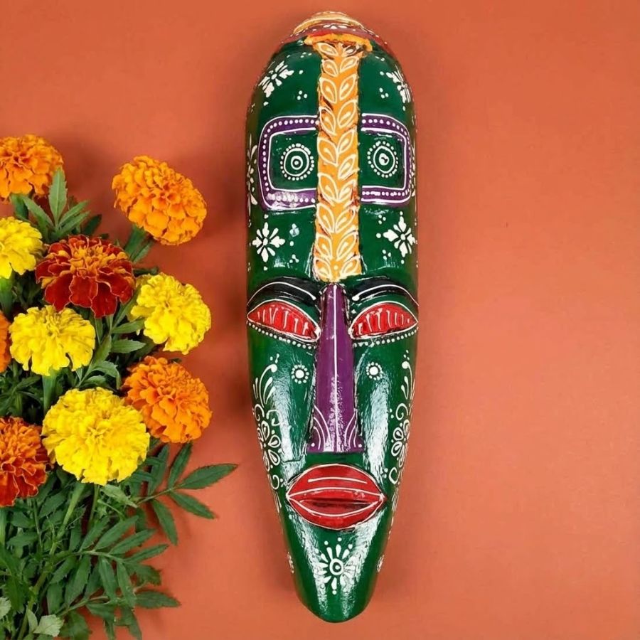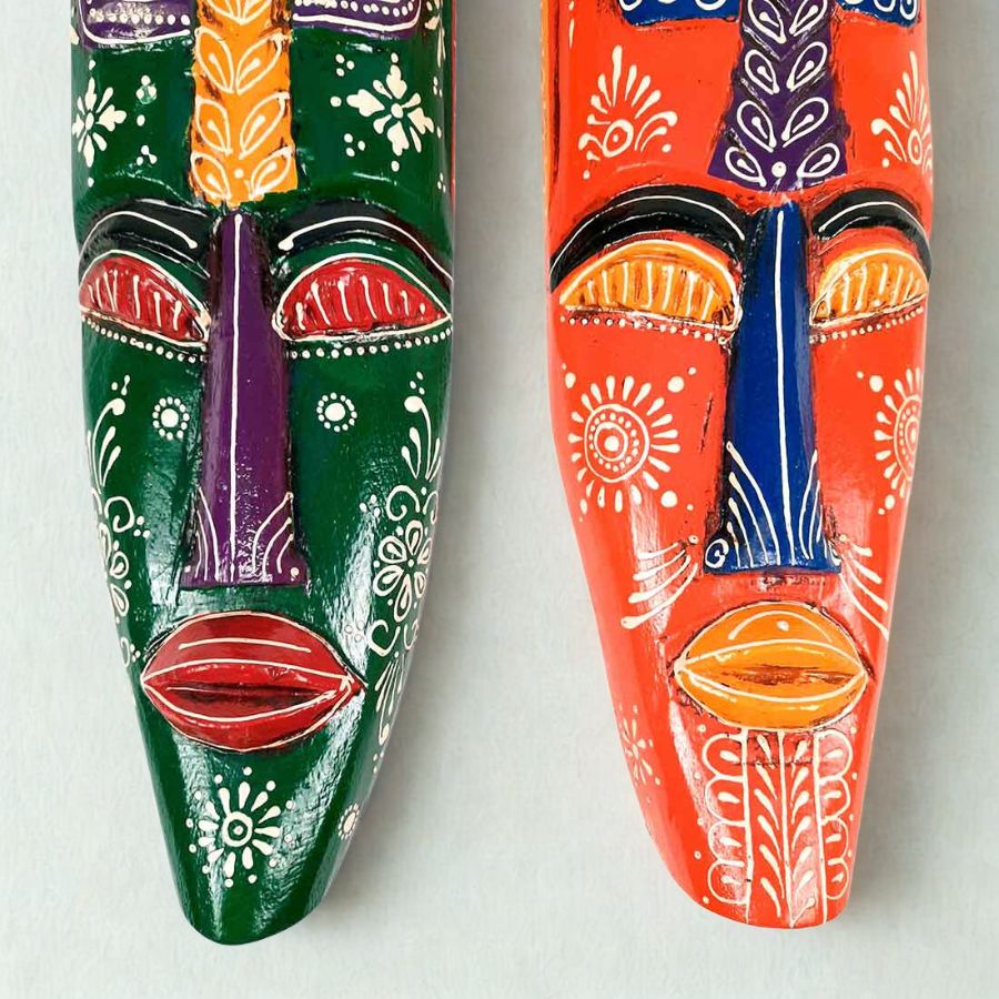 Furnshine – Green Orange African Egyptian Tribal Wall Mask Hanging Set – Nazar Battu Wooden Masks for Home Entrance, Living Room Decor – 18 Inch Pack of 2