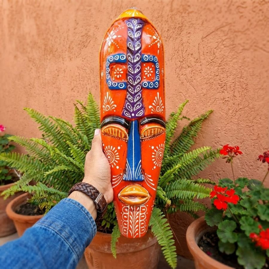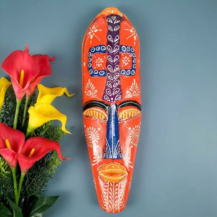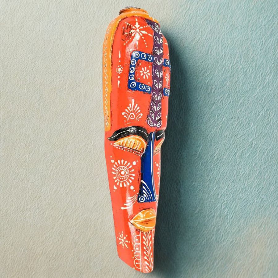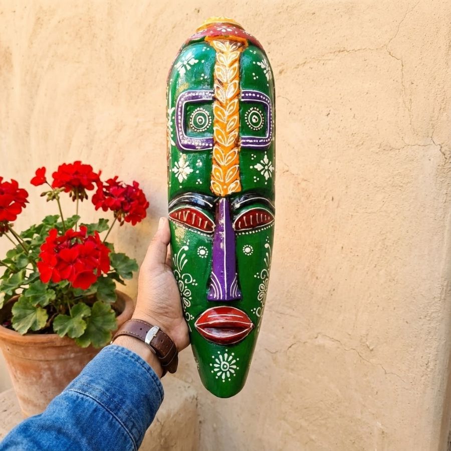 Elevate your home’s aesthetic with this vibrant Furn Shine African Egyptian Face Wall Mask Hanging set, featuring two handcrafted wooden tribal masks. Standing at 18 inches (45 cm) tall, 5 inches (13 cm) wide, and 2 inches (5 cm) deep each, they weigh just 1.2 kg total, making installation effortless on walls, doors, or plywood surfaces. Adorned in striking green, orange, purple, and blue hand-painted patterns, these Nazar Battu masks ward off negative energies while concealing old paint marks or nail holes for a polished look. Perfect for entrances, living rooms, hallways, or balconies, they add antique tribal charm to small apartments without occupying floor space. Thoughtful gifting for housewarmings or festivals, each piece boasts unique artisan variations for authentic appeal. Maintain vibrancy by wiping with a dry cloth—no liquids needed.