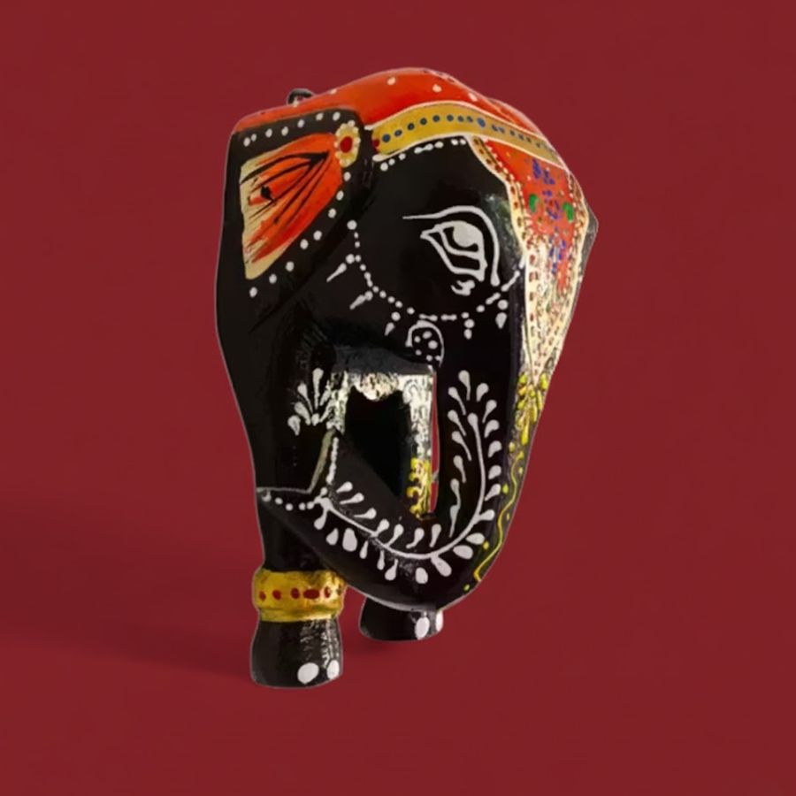 Discover this exquisite 7x4x3.5 inch handcrafted wooden elephant from Jodhpur artisans, blending traditional Indian artistry with auspicious symbolism. The glossy black body showcases elaborate red headscarf, golden jewelry accents, and delicate white floral patterns on curved trunk and flared ears, embodying prosperity and strength. Perfect for table decor, shelf accents, or small wall hangings, this compact religious piece suits pooja rooms, living spaces, or festive displays. Lightweight solid wood construction ensures durability, while non-toxic paints maintain vibrancy. Ideal for Diwali gifting, Vastu enhancement, or adding ethnic charm to modern homes. Authentic Jodhpur handicraft made in India brings cultural heritage to everyday elegance.