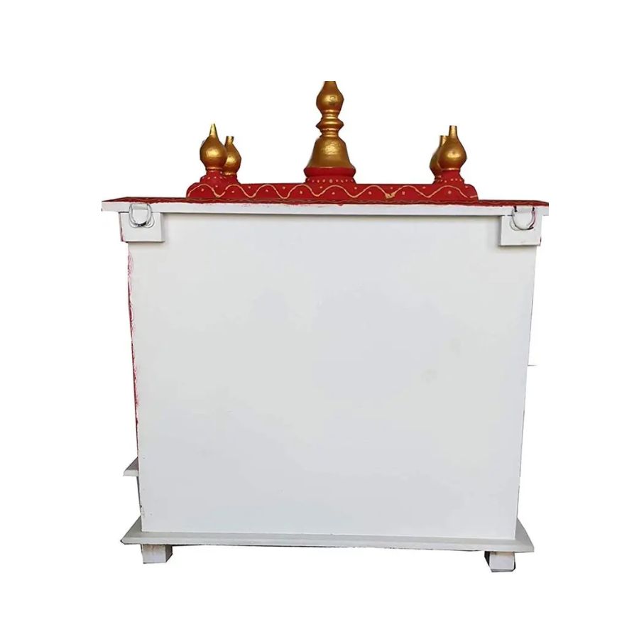 Handcrafted wooden pooja mandir in red and white finish with gold accents.