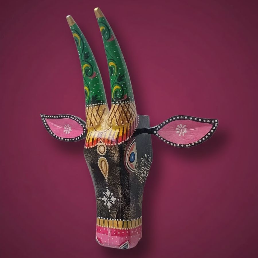 Transform your space with this striking 14-inch wooden painted bull face, a masterpiece of Rajasthani folk art blending spiritual symbolism and bold aesthetics. The majestic black base bursts with intricate multicolored details—emerald green curved horns, pink ears adorned with gold accents, turquoise eyes, and floral motifs in vivid pink, green, and gold. Perfect for pooja rooms, living room walls, jharokhas, or festive entrances, this lightweight 14 x 3 x 14 inch piece embodies Nandi’s sacred grace while adding boho-ethnic charm to modern homes, cafes, or boutiques. Each handcrafted detail by Rajasthani artisans ensures uniqueness, making it an ideal gift for Diwali, housewarmings, or cultural enthusiasts. Made in India for timeless elegance.