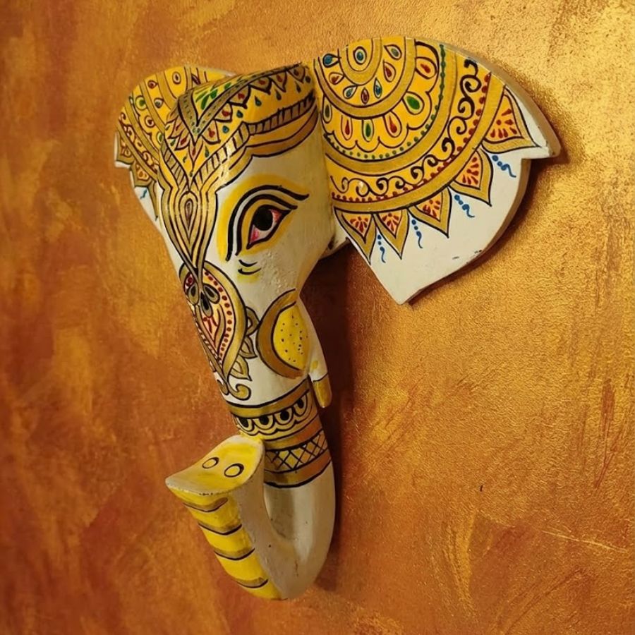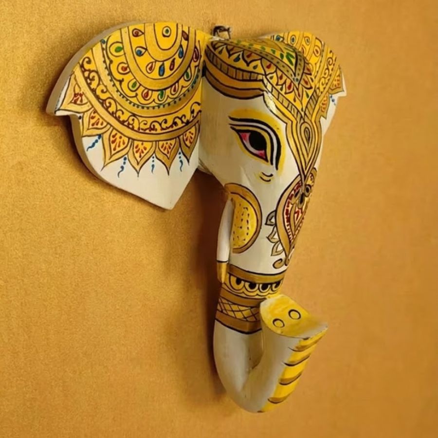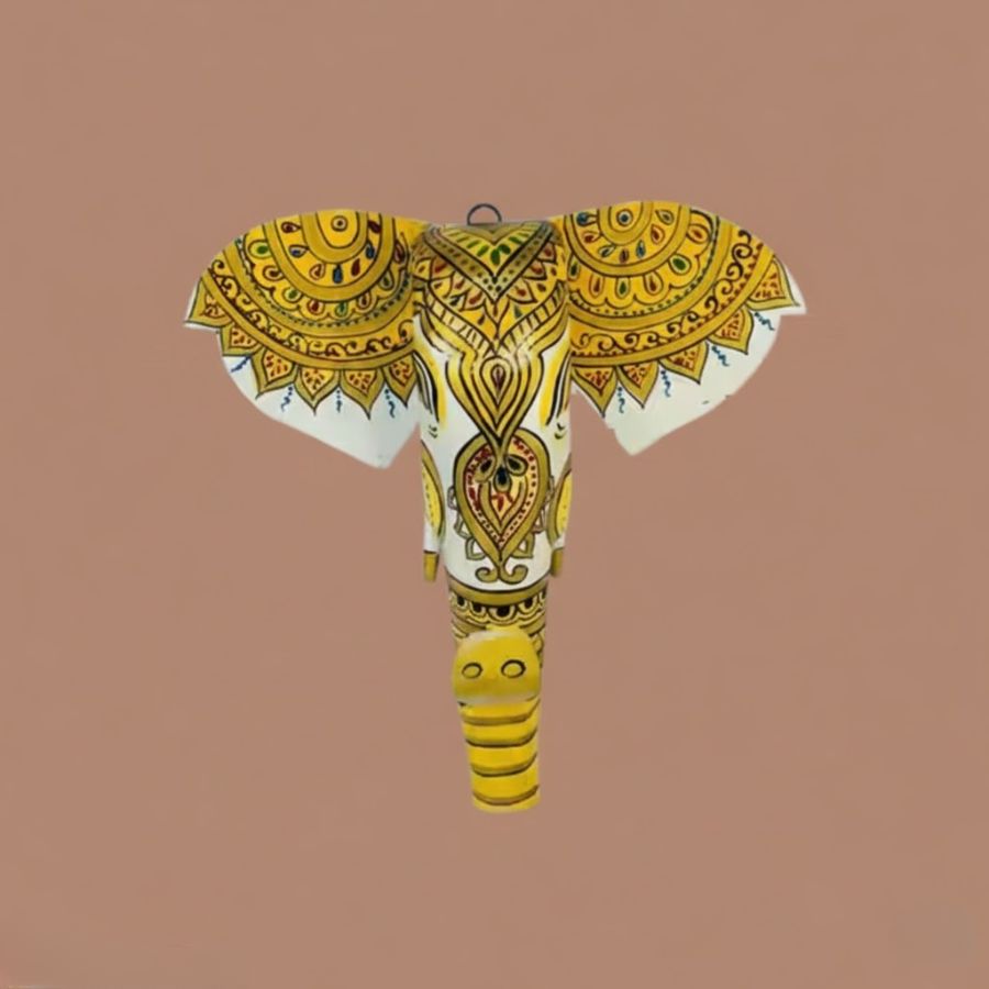 Bring home the charm of royal India with this handcrafted wooden painted elephant face wall hanging, beautifully inspired by Jodhpur tribal art. Detailed mandala-style patterns in warm yellow and white tones create a striking focal point for your living room, entryway or festive corner. Measuring approximately 10 x 3 x 10 inches, this statement piece fits easily above doors, consoles or gallery walls while still standing out as a bold décor accent. The smooth wooden base, hand-painted finish and convenient metal loop make it both durable and easy to hang. Perfect for Diwali, housewarming gifts or theme décor, this ethnic wall art instantly uplifts any modern or traditional space.