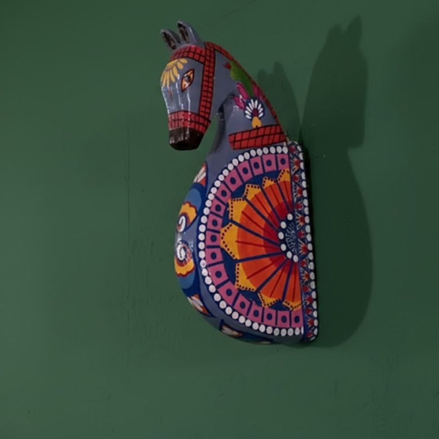Add a bold artistic statement to your walls with this Handcrafted Painted Horse Face Wall Décor. Inspired by traditional folk and tribal art, this decorative horse face showcases vibrant hand-painted patterns in striking shades of blue, red, orange, and white. Carefully crafted from durable material, it reflects skilled craftsmanship and cultural elegance, making it a perfect accent for living rooms, entryways, hallways, cafés, or ethnic-themed interiors. The expressive horse design symbolizes strength, grace, and positive energy, enhancing the overall ambience of your space. Lightweight and easy to hang, this wall décor effortlessly blends with modern, bohemian, and traditional décor styles. Whether used as a standalone art piece or paired with other wall accents, it instantly draws attention and adds character. An ideal gifting option for housewarmings, festivals, or art lovers, this horse face wall décor brings life, color, and heritage charm to any wall.