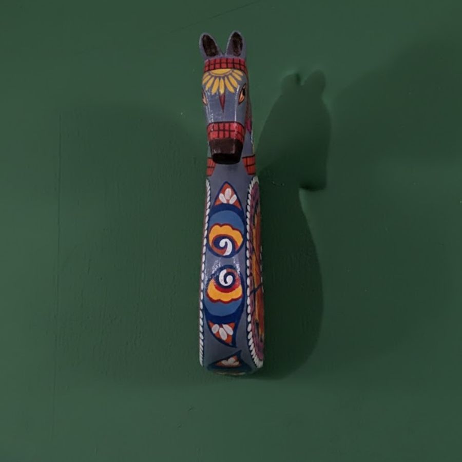 Hand-painted wooden horse face wall hanging.