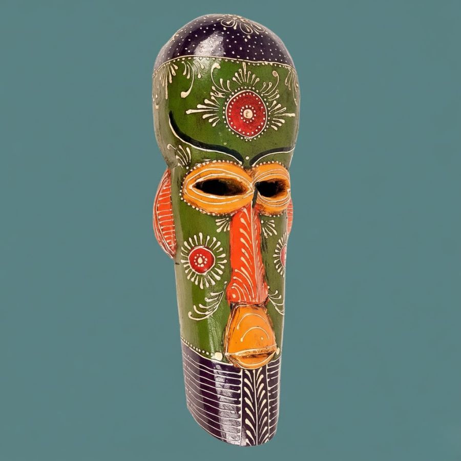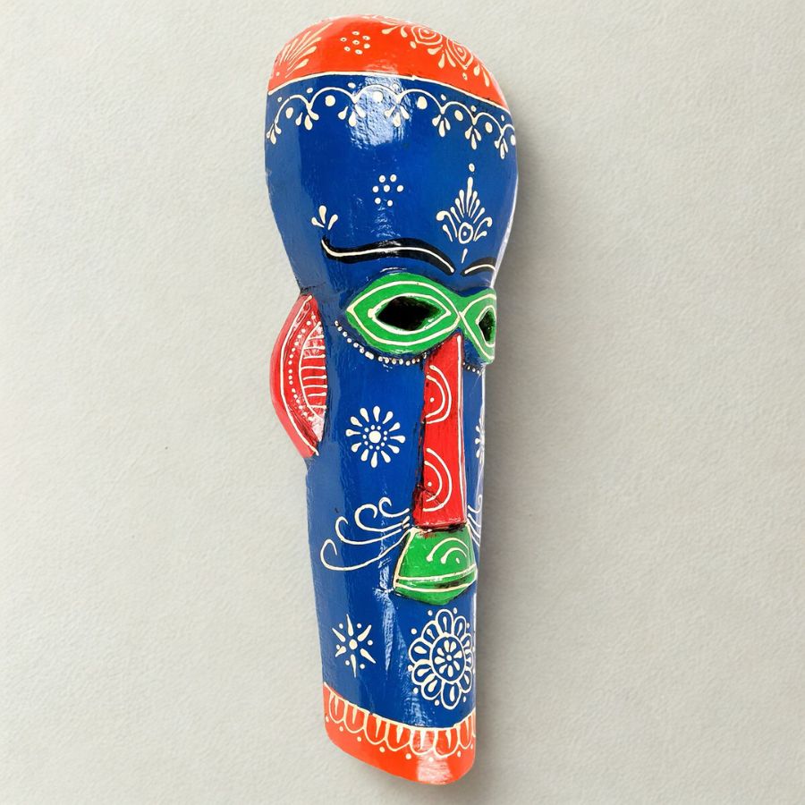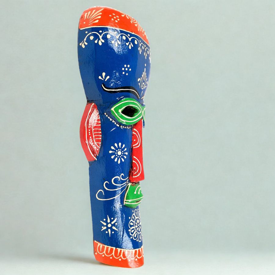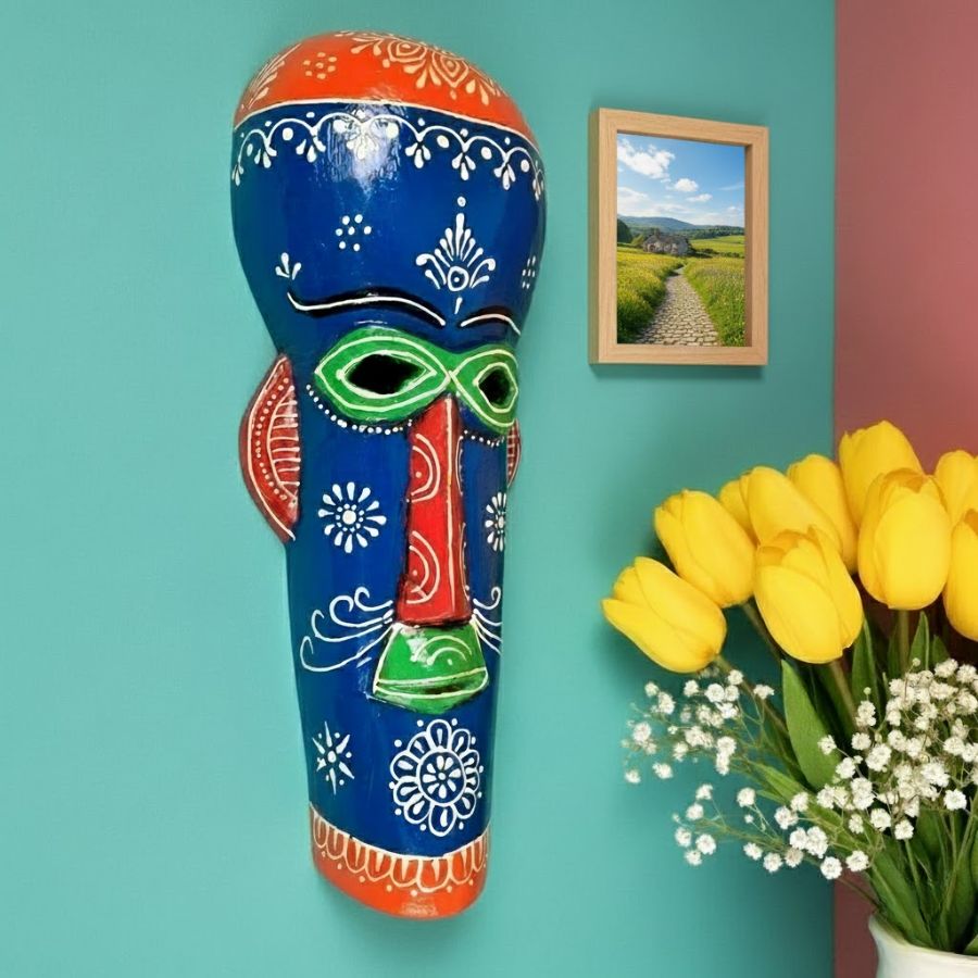Elevate your home with this 15-inch handcrafted tribal wooden wall mask in bold blue, blending African-Egyptian aesthetics as a potent Nazar Battu talisman. The elongated design (For Blue Color Variation) features a navy blue face with green-rimmed eyes, red nose and lips, intricate white patterns, and an orange top rim, set against textured white walls with yellow and white flowers and greenery. The elongated face features a (For Green Color Variation) deep green base with purple crown and chin, sunburst mandala motifs, orange eye rims and nose, and red floral accents, hanging against a dark wall beside lush greens and white blooms for dramatic contrast. Measuring 38 cm tall, 15 cm wide, and 6 cm deep at 560 grams, it suits entrances, living rooms, hallways, balconies, offices, or cafes. This Drishti Bomma-inspired piece wards off negativity, fuses tradition with modernity, and ignites conversations—ideal for housewarmings or ethnic decor. Artisan-crafted with unique details, clean with a dry cloth for lasting vibrancy.