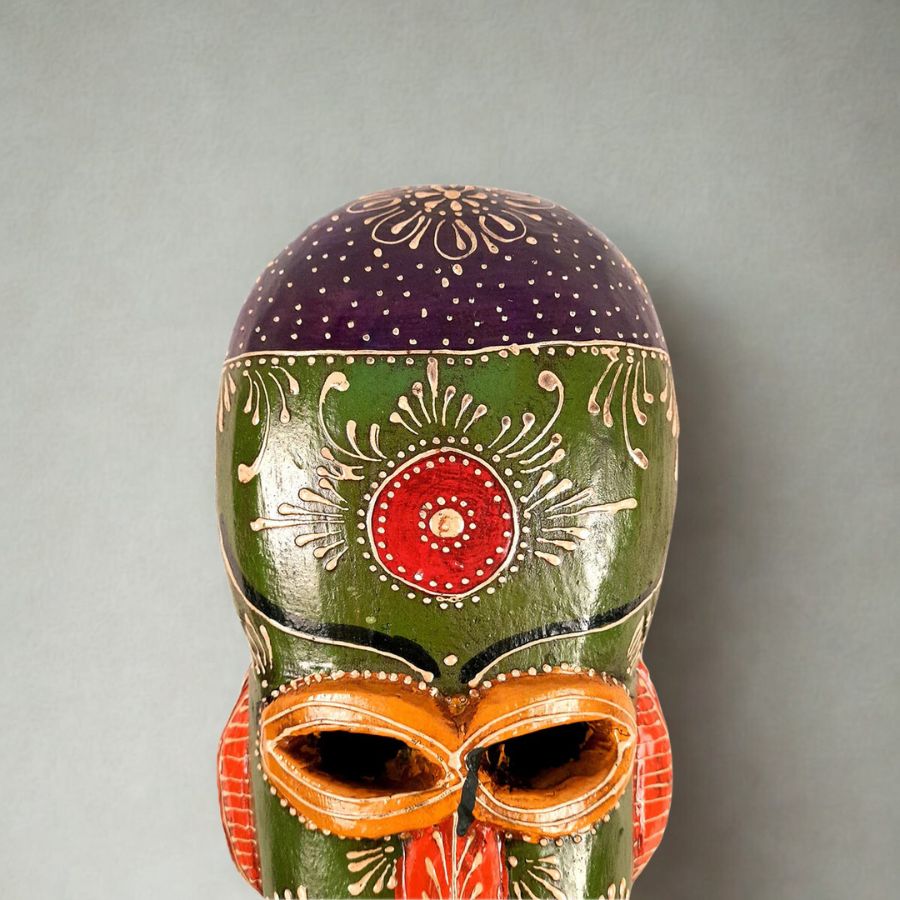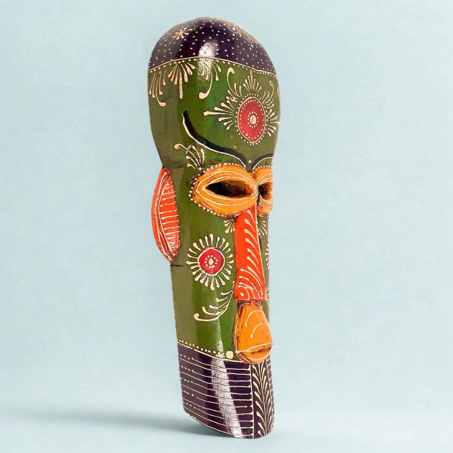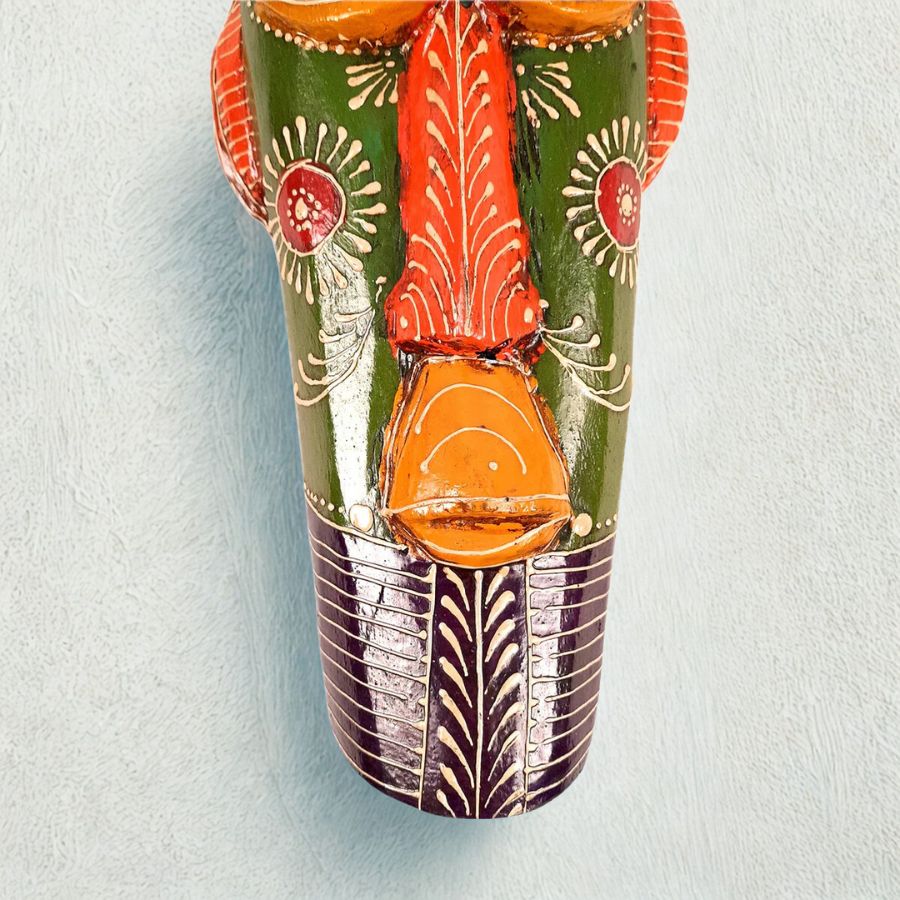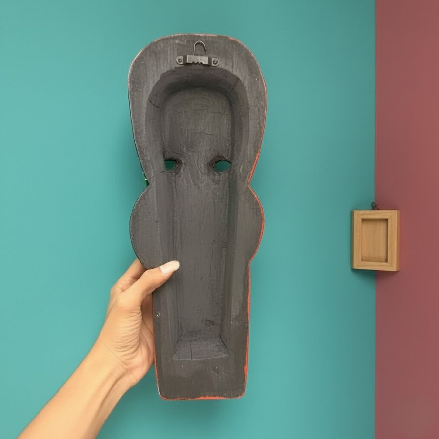Elevate your home with this 15-inch handcrafted tribal wooden wall mask in bold blue, blending African-Egyptian aesthetics as a potent Nazar Battu talisman. The elongated design (For Blue Color Variation) features a navy blue face with green-rimmed eyes, red nose and lips, intricate white patterns, and an orange top rim, set against textured white walls with yellow and white flowers and greenery. The elongated face features a (For Green Color Variation) deep green base with purple crown and chin, sunburst mandala motifs, orange eye rims and nose, and red floral accents, hanging against a dark wall beside lush greens and white blooms for dramatic contrast. Measuring 38 cm tall, 15 cm wide, and 6 cm deep at 560 grams, it suits entrances, living rooms, hallways, balconies, offices, or cafes. This Drishti Bomma-inspired piece wards off negativity, fuses tradition with modernity, and ignites conversations—ideal for housewarmings or ethnic decor. Artisan-crafted with unique details, clean with a dry cloth for lasting vibrancy.