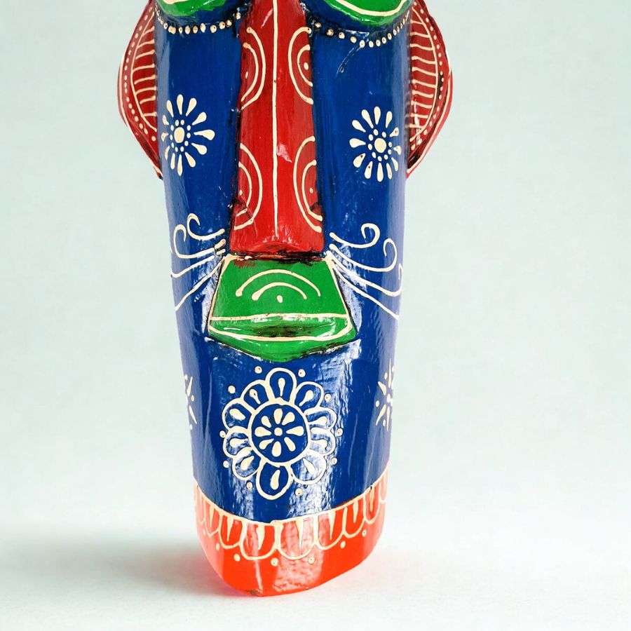 Vibrant Blue Color Palette: Blue face with green eyes, red nose, orange accents, and white ethnic detailing.