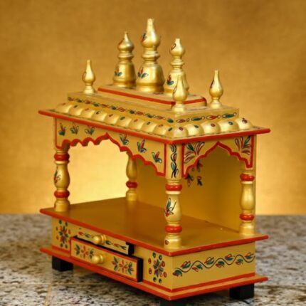 Hand‑painted solid wood mandir with intricate Rajasthani artwork.