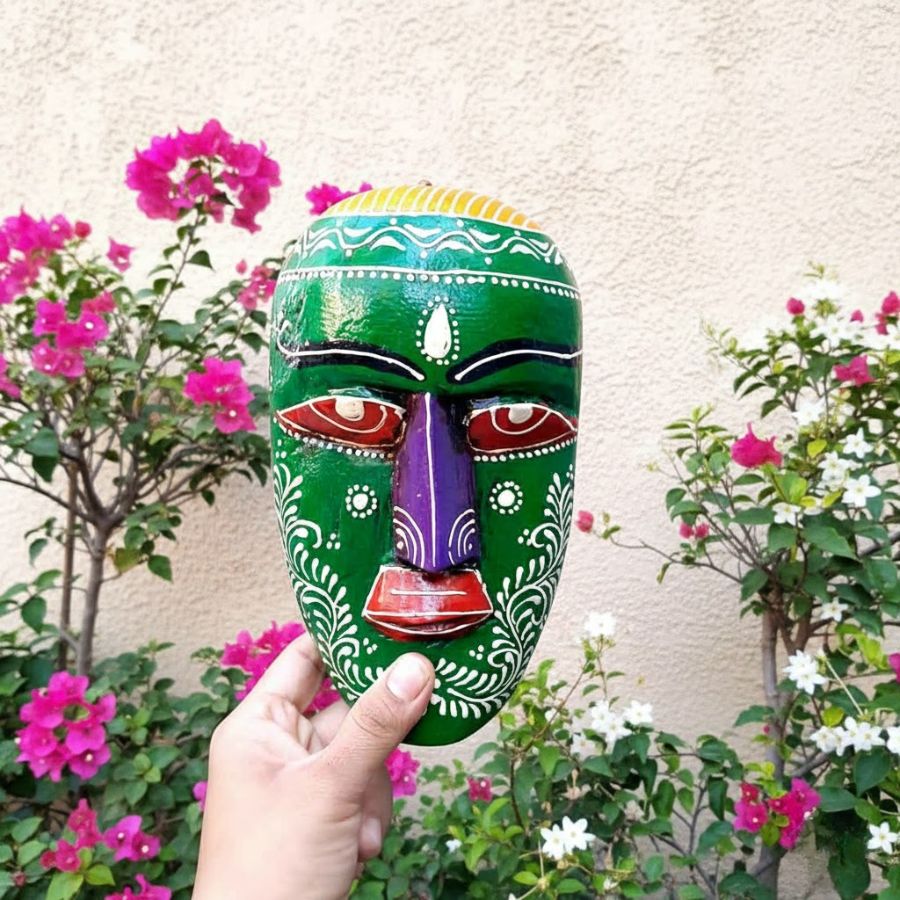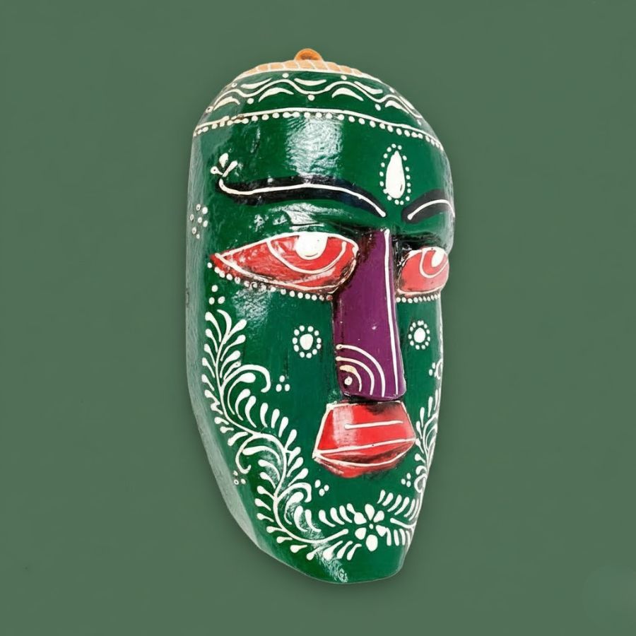 Furnshine – Handcrafted Green Wooden Tribal Wall Mask – Nazar Battu for Home Entrance, Living Room & Ethnic Decor – 9 Inch Hand Painted Hanging Art