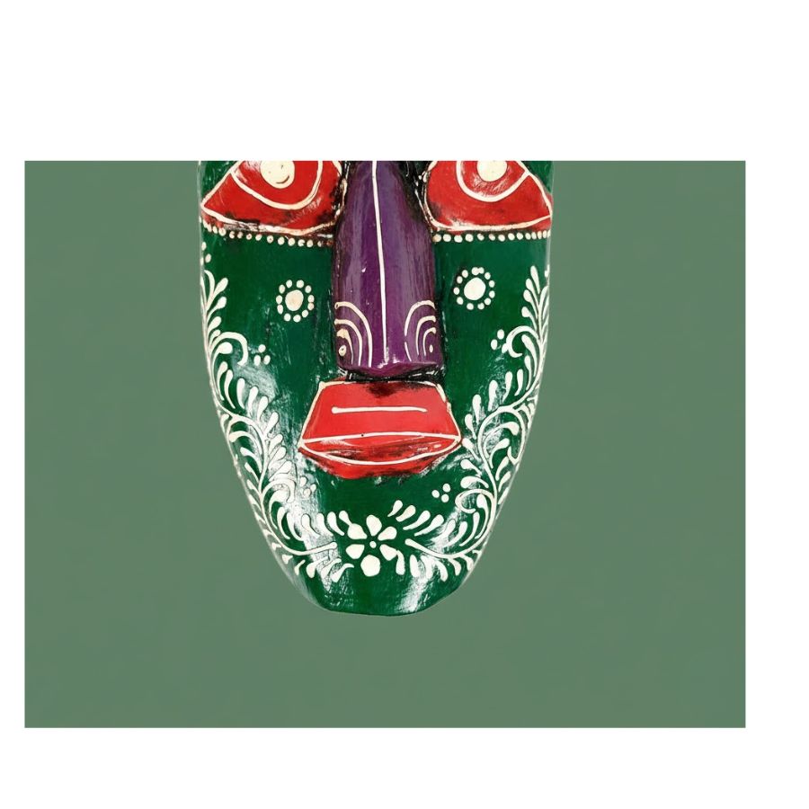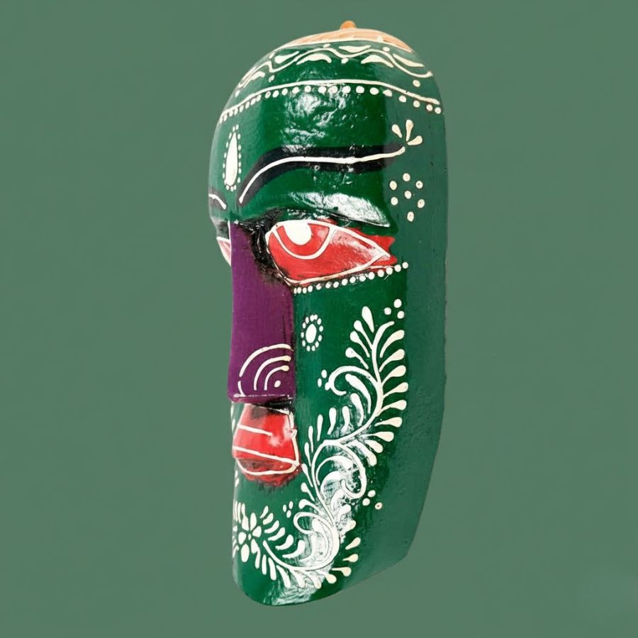 Handcrafted wooden tribal mask in vivid green with red and purple accents.