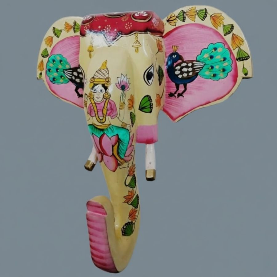 Adorn your space with divine elegance through this handcrafted wooden elephant face wall hanging from Furn Shine, carved from premium mango wood. The cream elephant carries Goddess Lakshmi in traditional attire, surrounded by peacock feathers, pink ears, green accents, and lotus details, celebrating Rajasthan’s spiritual handicraft legacy. As a potent Vastu symbol of abundance, fortune, and divine grace, it infuses pooja rooms, entrances, or living walls with auspicious energy and cultural reverence. At 15x3x15 inches, this lightweight, ready-to-hang masterpiece features durable hand-painting that withstands time. Ideal for Diwali gifting, housewarmings, or devotional displays, it combines eco-friendly craftsmanship with opulent, story-rich beauty.