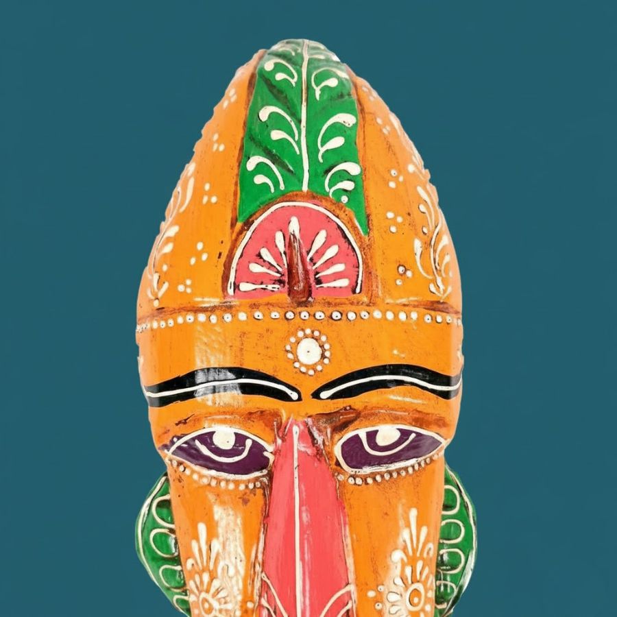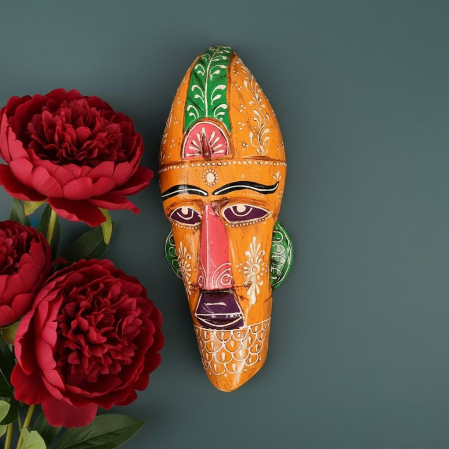 Unleash vibrant tribal artistry on your walls with this handcrafted wooden mask from Furn Shine’s collection. The elongated form glows in warm orange tones, crowned with green accents and a radiant forehead motif, complemented by purple eyes, pink nose, and detailed white floral swirls for an exotic, eye-catching appeal. Precisely sized at 13 cm x 7 cm x 30 cm (5 x 3 x 12 inch) and weighing 320 g, it enhances entrances, living rooms, hallways, balconies, or offices without dominating the space. The polished glossy surface protects intricate hand-painted details, while the easy-hang mechanism allows quick wall installation. As a Nazar Battu, it guards against negative energies, infusing cultural mystique and positive vibes into modern interiors. Perfect for gifting during festivals or housewarmings, this mask turns any wall into a conversation starter.