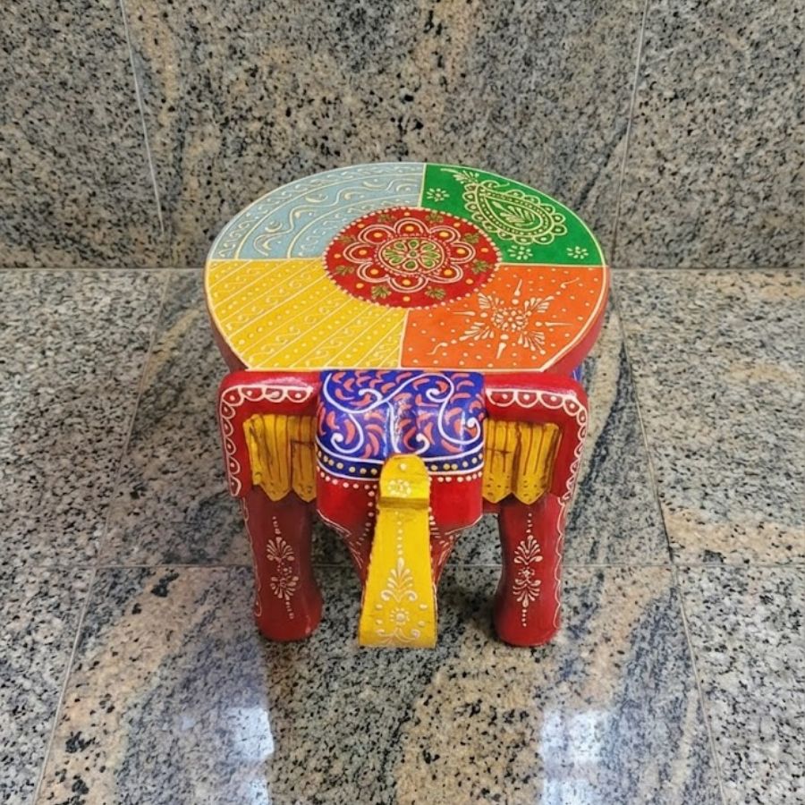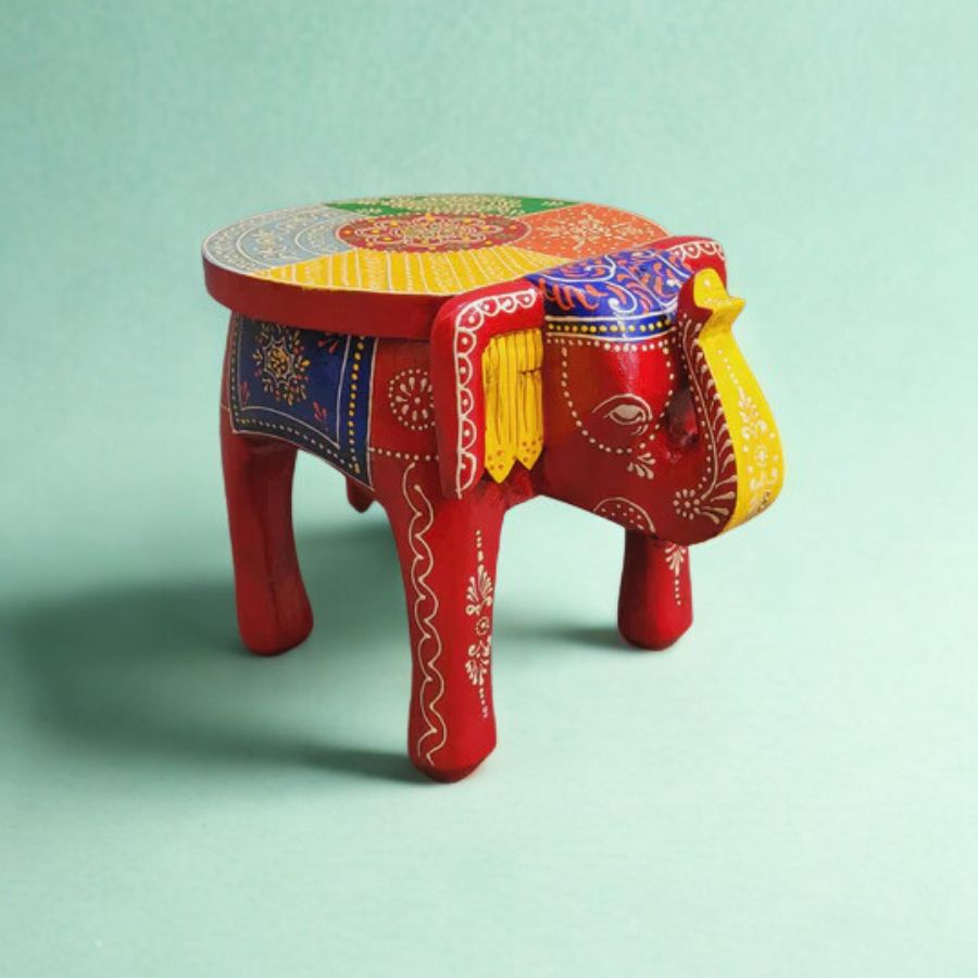 Furnshine – Handcrafted Red Multicolor Wooden Elephant Stool – Large Indian Handicraft for Pooja, Home & Foyer Decor (8″H x 11″L x 8″W)