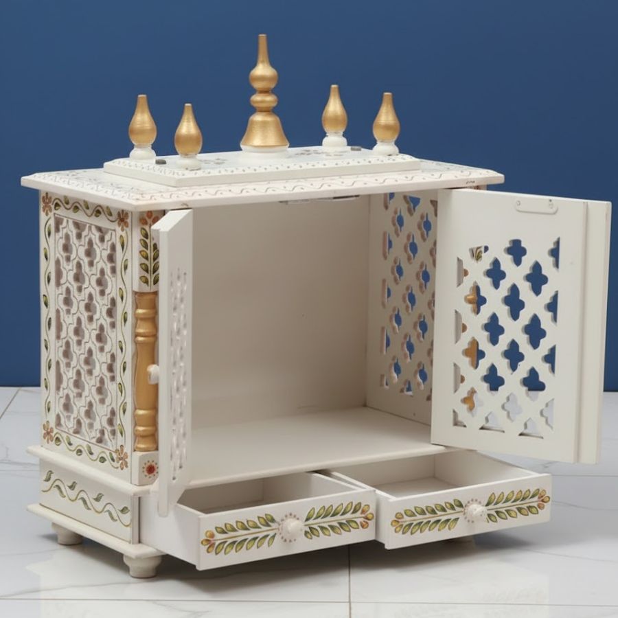 Built‑in bottom drawer for storing diya, incense sticks and pooja accessories.