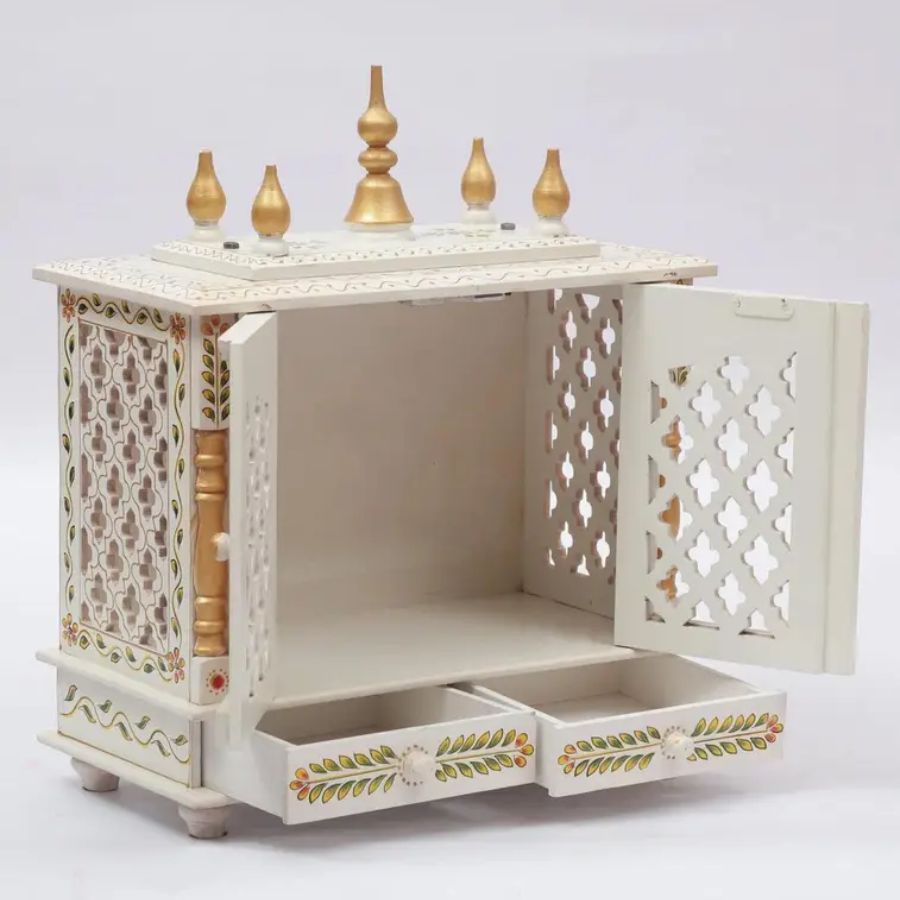 - Built-in storage drawer for keeping pooja accessories organized.