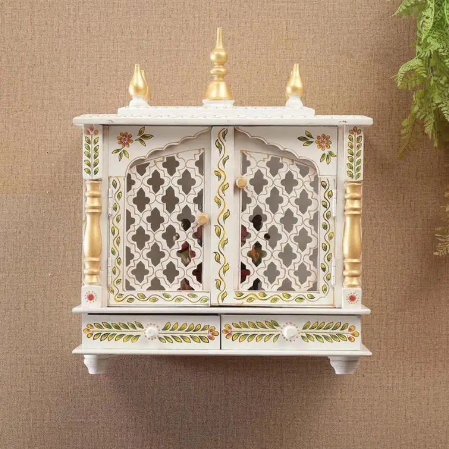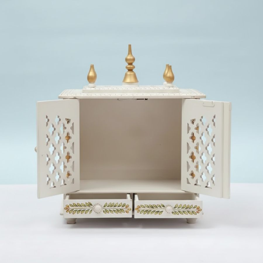 Furnshine – Handcrafted Wooden Pooja Mandir for Home – White Gold Temple with Double Drawer & Decorative Doors for Home and Office Décor