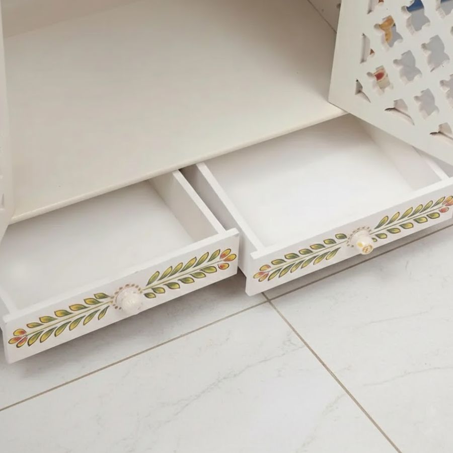Two pull-out drawers to organize pooja samagri and small accessories.