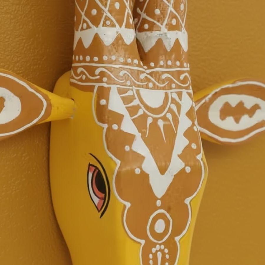This hand-painted wooden cow face wall hanging adds a bright, festive touch to any corner of your home. Crafted from durable wood by Furn Shine artisans, it features a vivid yellow base adorned with detailed white tribal-style motifs and expressive eyes that instantly draw attention. Compact yet impactful at approximately 10 × 2 × 10 inches, it is perfect for accenting entryways, pooja rooms, living rooms, or balcony walls. Lightweight construction and a ready-to-hang back make installation quick and hassle-free. This decor accent pairs beautifully with plants and frames, giving your space an ethnic, handcrafted vibe and making it an ideal gifting choice for housewarmings and festive occasions.