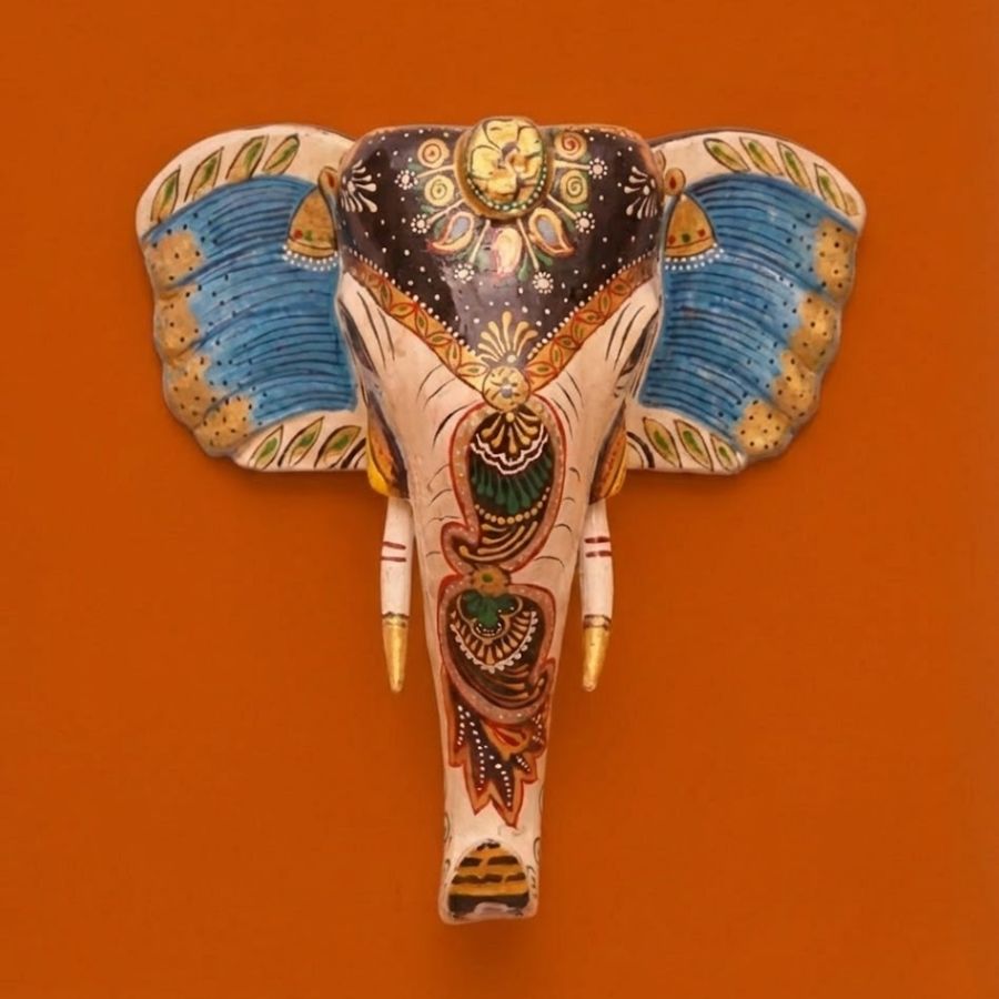 Bring home this elegant wooden painted elephant face and give your walls a rich, artisanal upgrade. Handcrafted from sturdy wood by Jodhpur artisans, it features a serene white elephant profile adorned with intricate floral and paisley motifs, highlighted in blue, mustard, green and red for a royal look. The 12 x 3 x 12 inch size makes it a perfect hero piece for entryways, living rooms, pooja corners or statement walls. Finished with a smooth protective coating, this lightweight wall hanging is easy to mount and blends beautifully with ethnic, boho or contemporary interiors. Symbolizing wisdom, protection and good fortune, it also makes a meaningful gift for housewarmings, festive occasions and decor lovers across India and abroad.