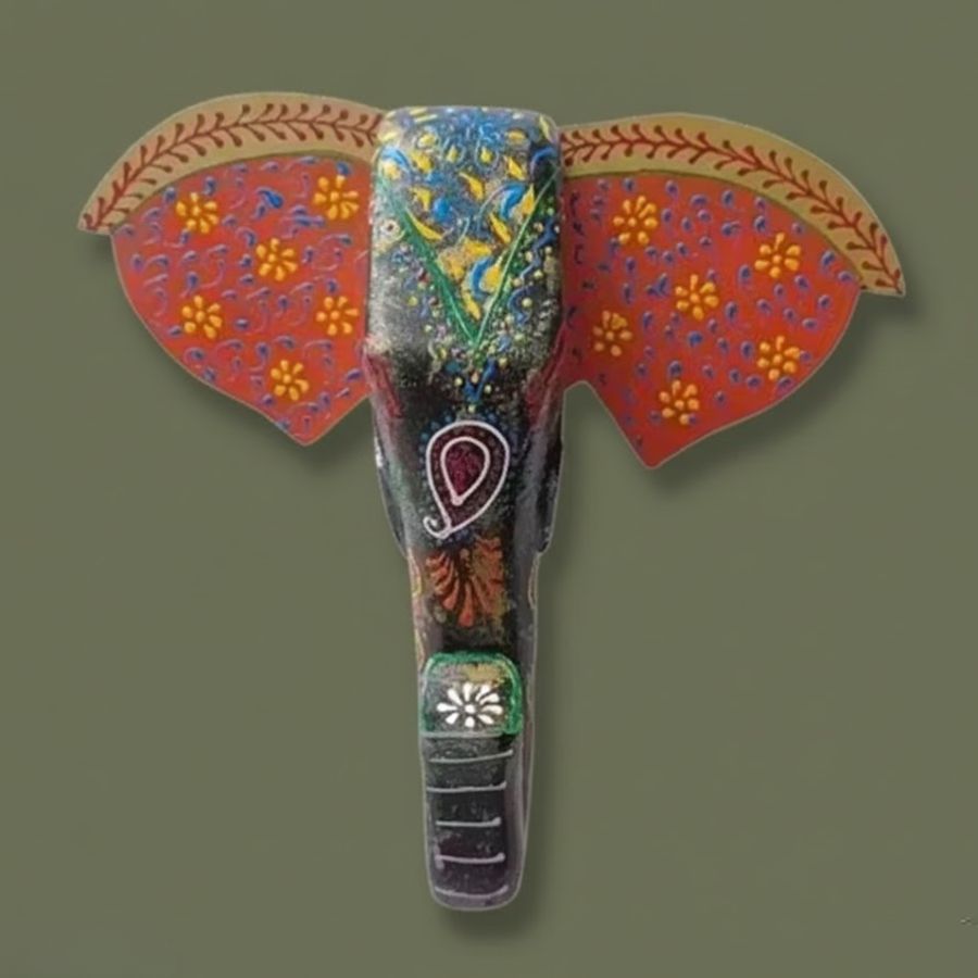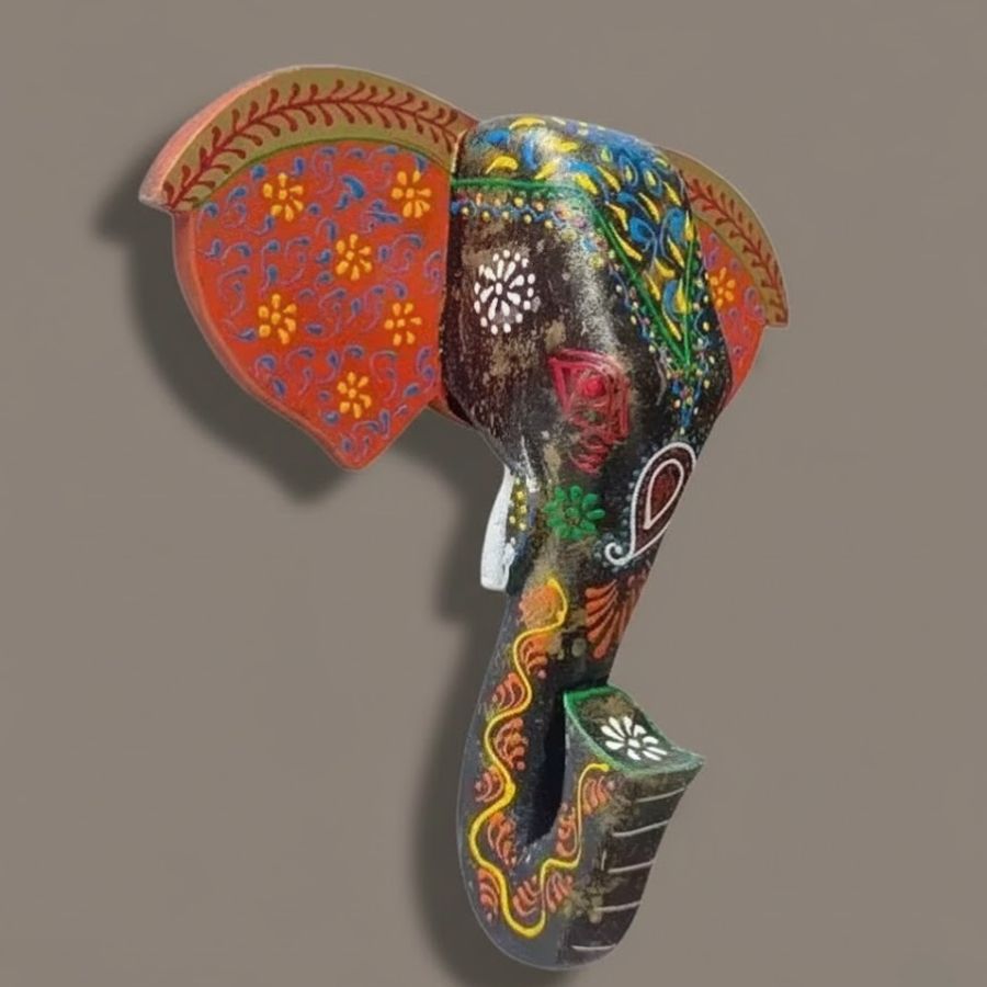Bring home the charm of traditional Indian craftsmanship with this beautifully handcrafted Wooden Painted Elephant Face Wall Hanging. Inspired by folk and tribal art, this decorative piece showcases a graceful elephant face adorned with intricate hand-painted floral and ethnic patterns. The rich blend of earthy tones and vibrant colors adds depth and character, making it a striking focal point for any wall. Symbolizing wisdom, strength, and good fortune, the elephant motif is ideal for enhancing positive energy in your living space. Carefully crafted by skilled artisans, each piece reflects authentic handmade detailing, ensuring no two are exactly alike. Lightweight and easy to hang, it is perfect for living rooms, entrances, pooja rooms, offices, or festive décor. This elephant face wall décor effortlessly blends tradition with artistic elegance.
