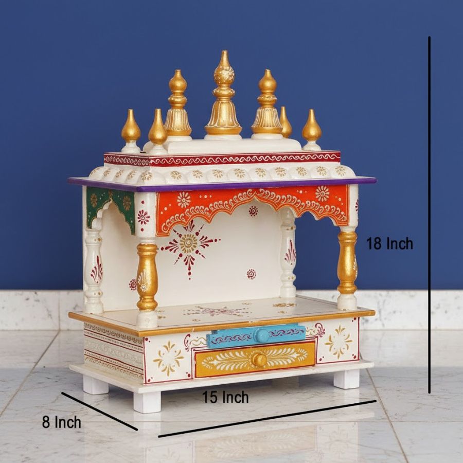 - Handcrafted wooden mandir with multicolor Rajasthani-style painting and golden shikhars.