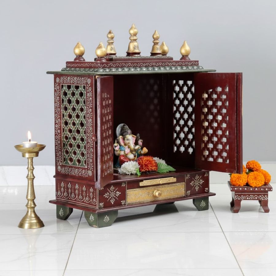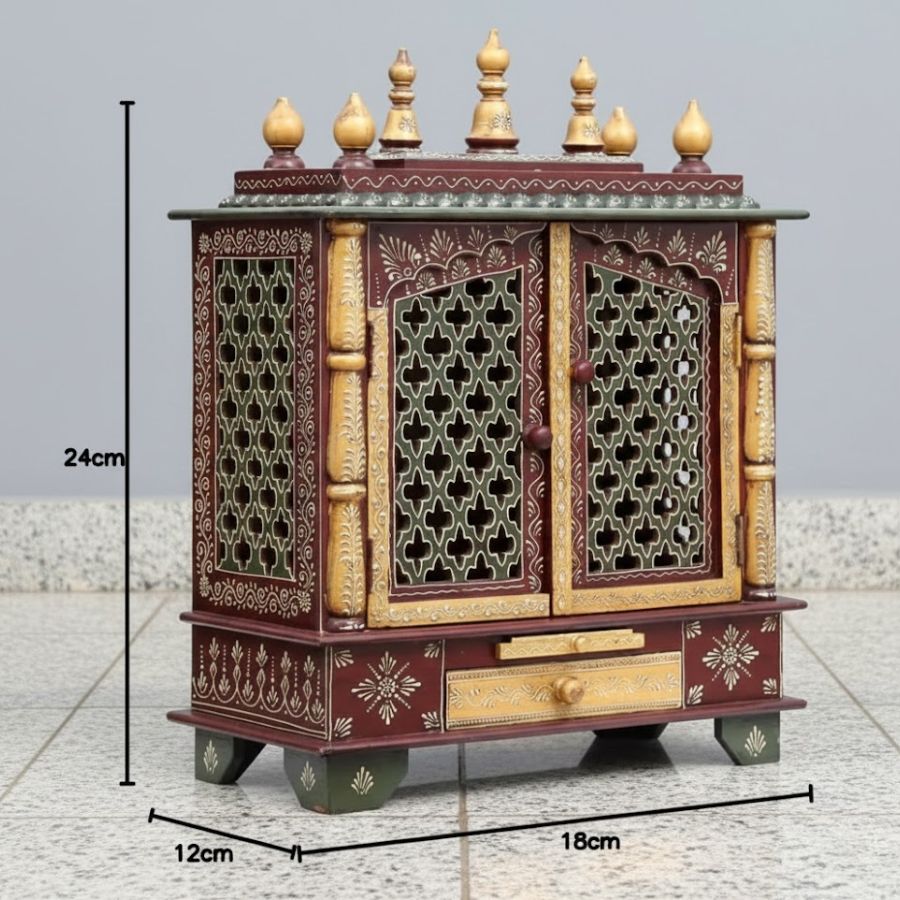 - Bottom storage drawer for pooja essentials like incense and diya.
