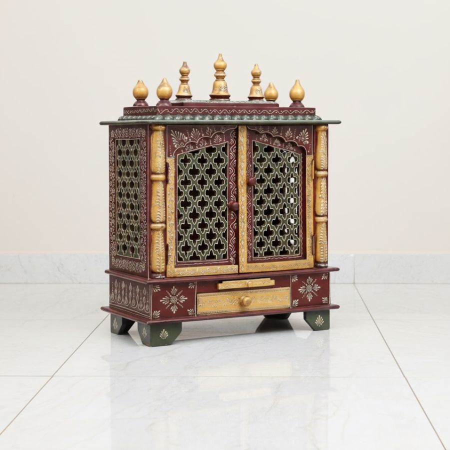 Furnshine – Handcrafted Wooden Pooja Mandir for Home | Maroon, Gold & Green Temple with Jaali Doors & Storage Drawer