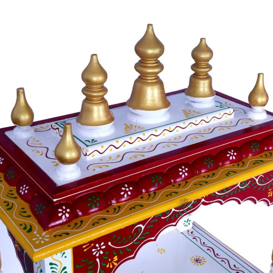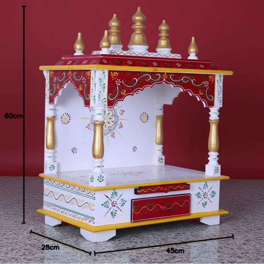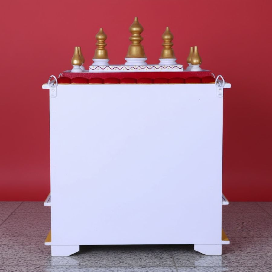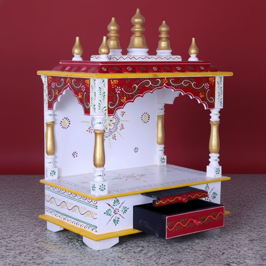 Furnshine – Handcrafted Wooden Pooja Mandir for Home – Open Temple with Drawer, Red White Hand-Painted Design & Golden Shikharas for Home and Office Décor