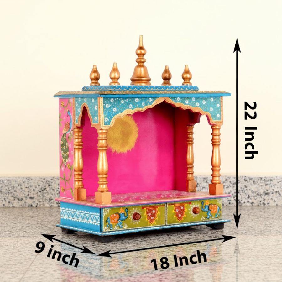Furnshine – Handcrafted Wooden Temple for Home | 18x9x22 Inch Rajasthani Hand-Painted Pooja Mandir with Drawers | Multicolor Finish
