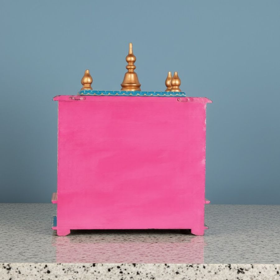 Create a vibrant and divine prayer corner with this beautifully handcrafted Wooden Home Temple from Furn Shine. Designed in traditional Rajasthani style, this pooja mandir features a lively blend of pink, blue, green, and gold tones, enhanced with intricate hand-painted motifs and elephant artwork that symbolize prosperity and positivity. Crafted from premium quality wood, it offers strength, durability, and long-lasting appeal. The spacious prayer platform comfortably accommodates idols, diyas, and incense holders, while the two lower drawers provide practical storage for pooja essentials. Elegant turned pillars, decorative arches, and kalash finials give the temple a royal and devotional charm. Its compact yet grand size makes it perfect for homes, apartments, or offices. More than just a mandir, this wooden temple doubles as an eye-catching piece of ethnic décor that adds spiritual warmth, cultural richness, and timeless beauty to any interior space.